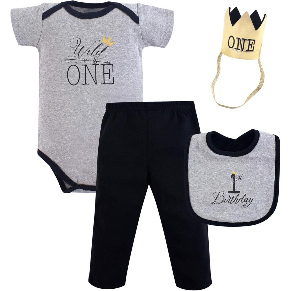 Hudson Baby first birthday outfit gift set is the perfect outfit for your little one's first party! outfit includes a bodysuit, pant and bib set along with an adorable birthday crown. This outfit is great for wild one birthday party themes and can also be worn any other day! this set is packaged in a gift box with ribbon for gift giving! generally fits babies size 12 months.