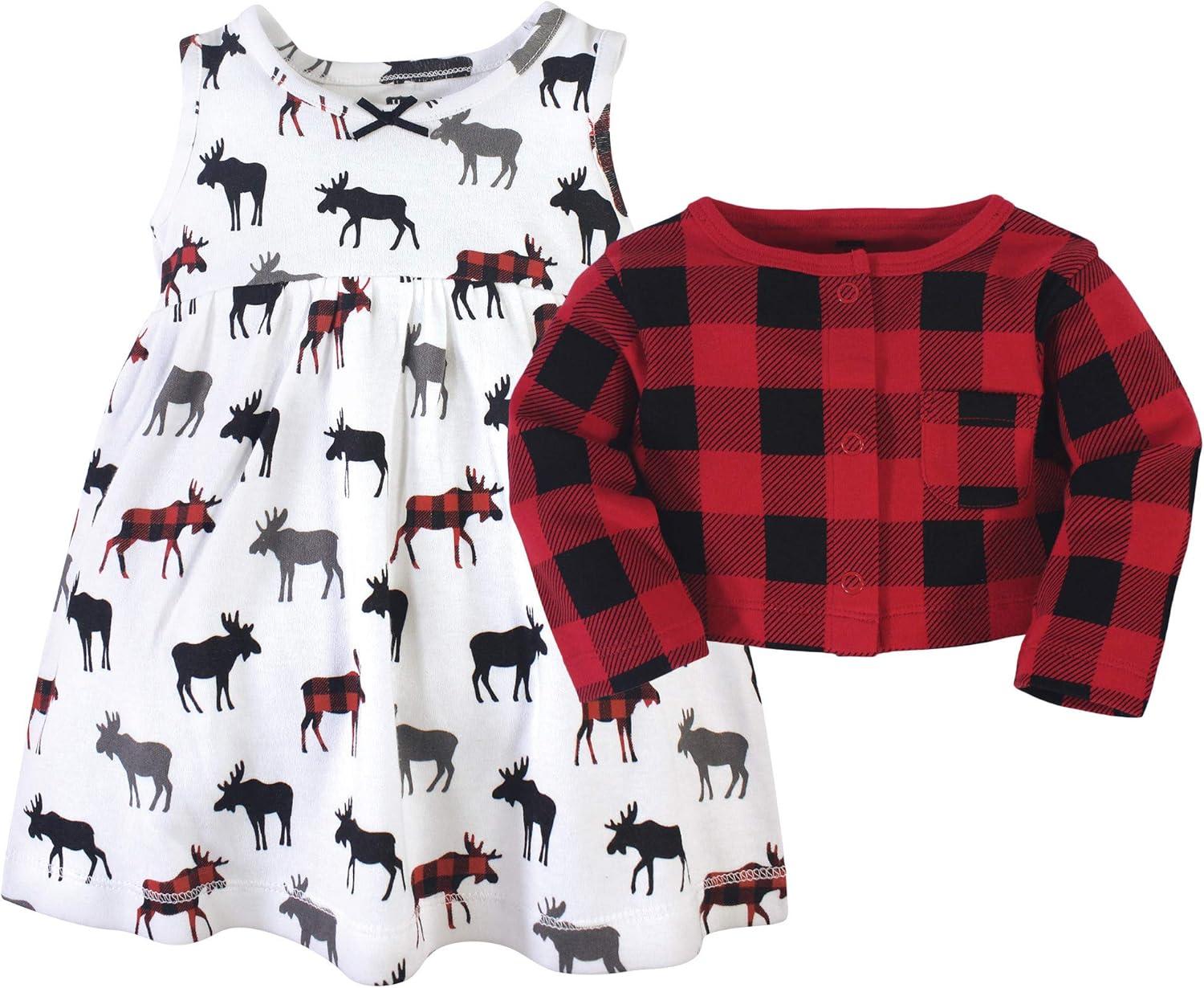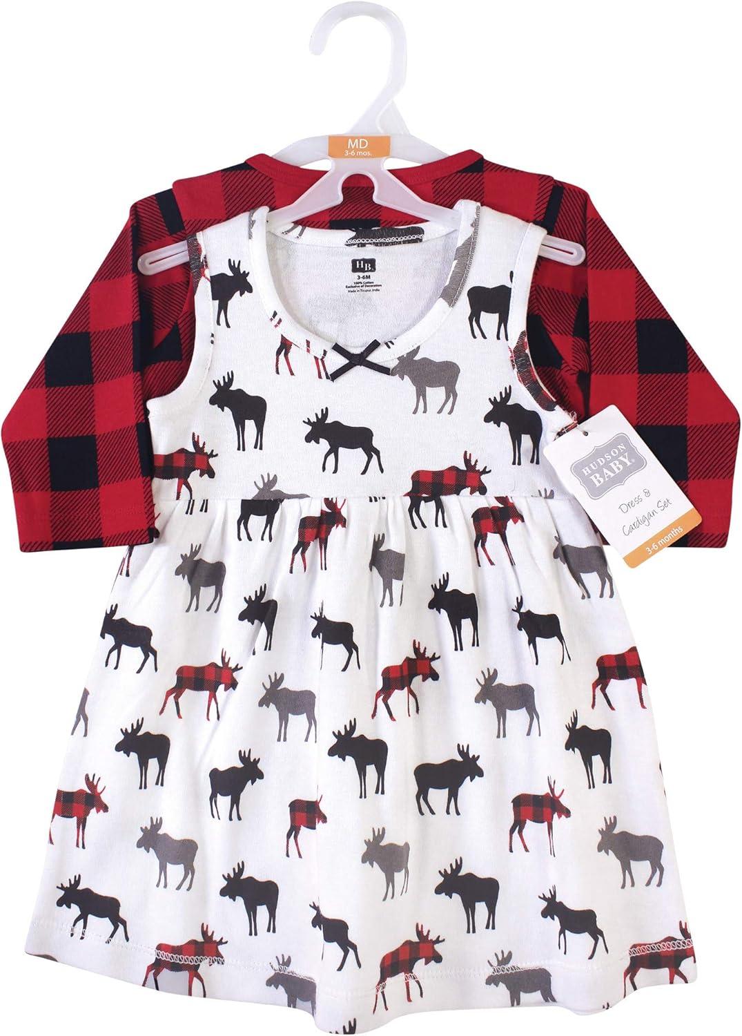 Hudson Baby Baby Girls’ Cotton Dress and Cardigan Set(Buffalo Plaid Moose)