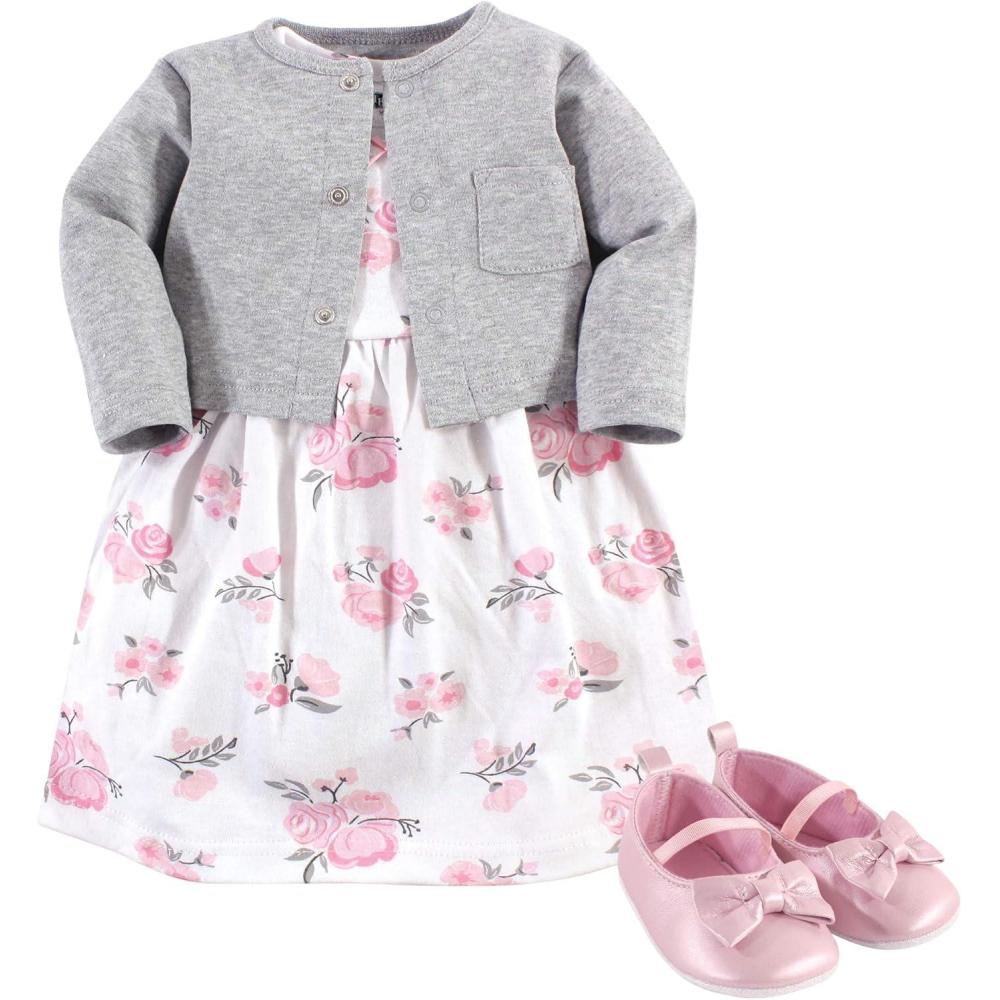 Hudson Baby baby-girls Cotton Dress, Cardigan and Shoe Multi-pack Set(Pink Gray Floral)