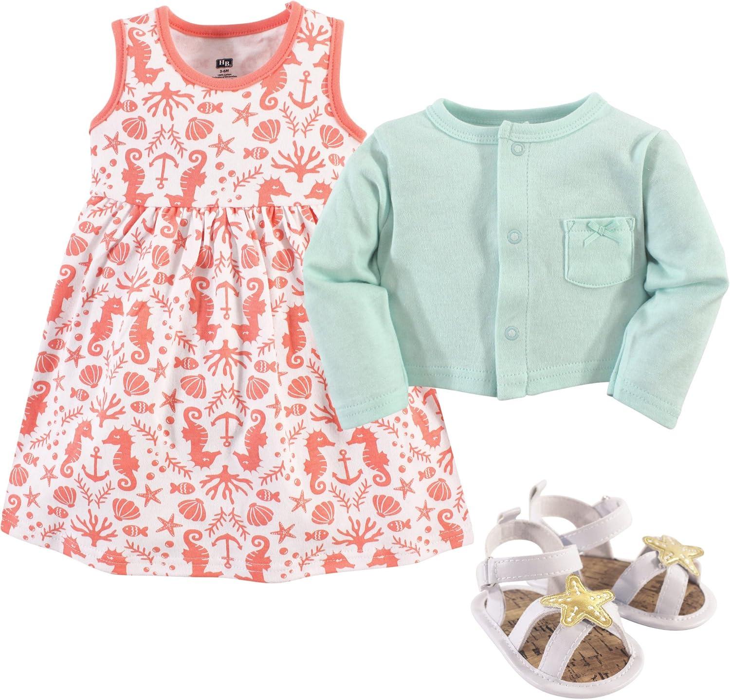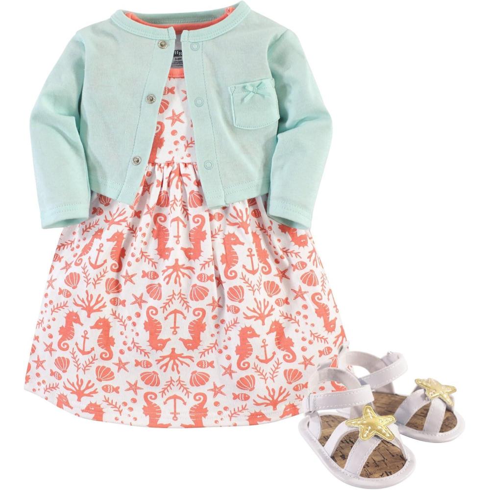 Hudson Baby baby-girls Cotton Dress, Cardigan and Shoe Multi-pack Set(Sea)