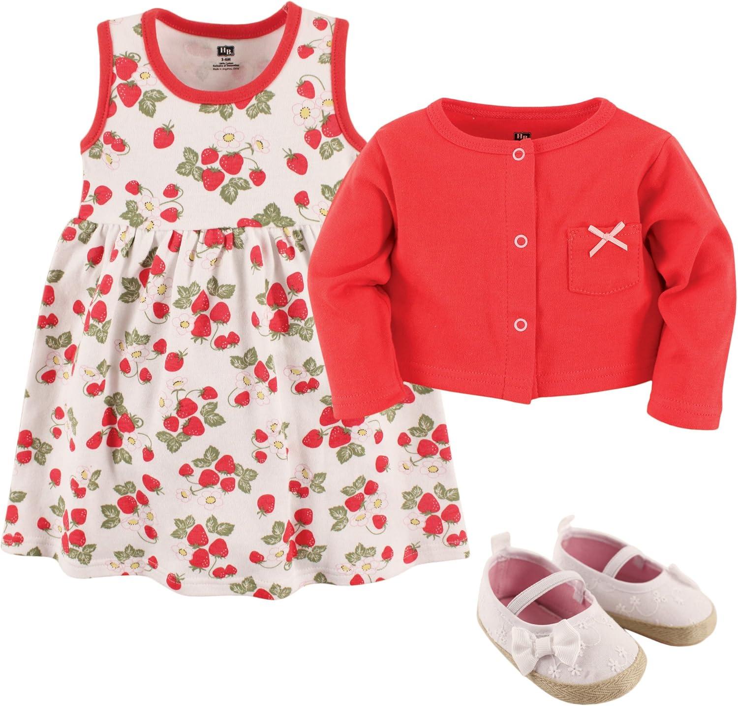 Hudson Baby baby-girls Cotton Dress, Cardigan and Shoe Multi-pack Set(Strawberry)
