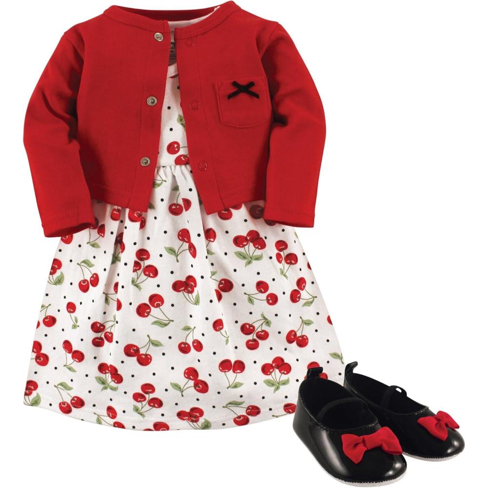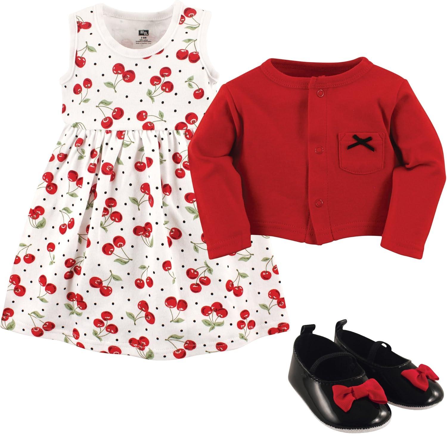 Hudson Baby baby-girls Cotton Dress, Cardigan and Shoe Set(Cherries)