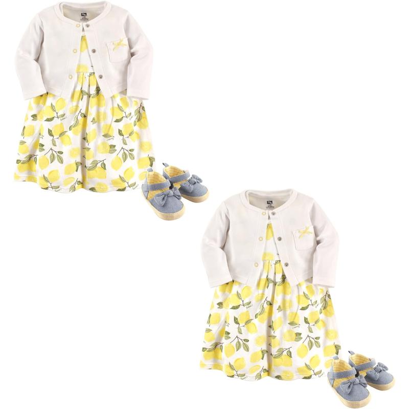 Hudson Baby baby-girls Cotton Dress, Cardigan and Shoe Set(Lemon 6-piece)