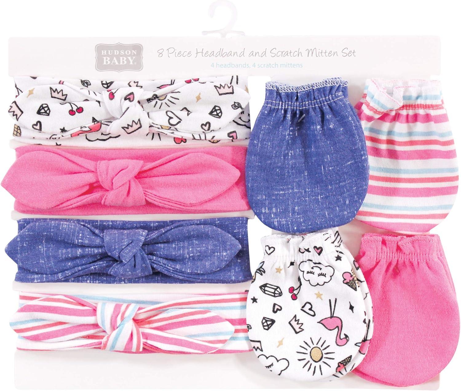 Hudson Baby headband and scratch mitten set is a perfect accessory set for your little girl. Each set comes with coordinating headbands and scratch mittens. Our headbands are a fun headwrap for your baby girl to look stylish with our adorable prints. Our scratch mittens are made with super soft cotton fabric and an elastic band around the wrist so the mittens stay on and protect your little one's face and body from any accidental scratches.