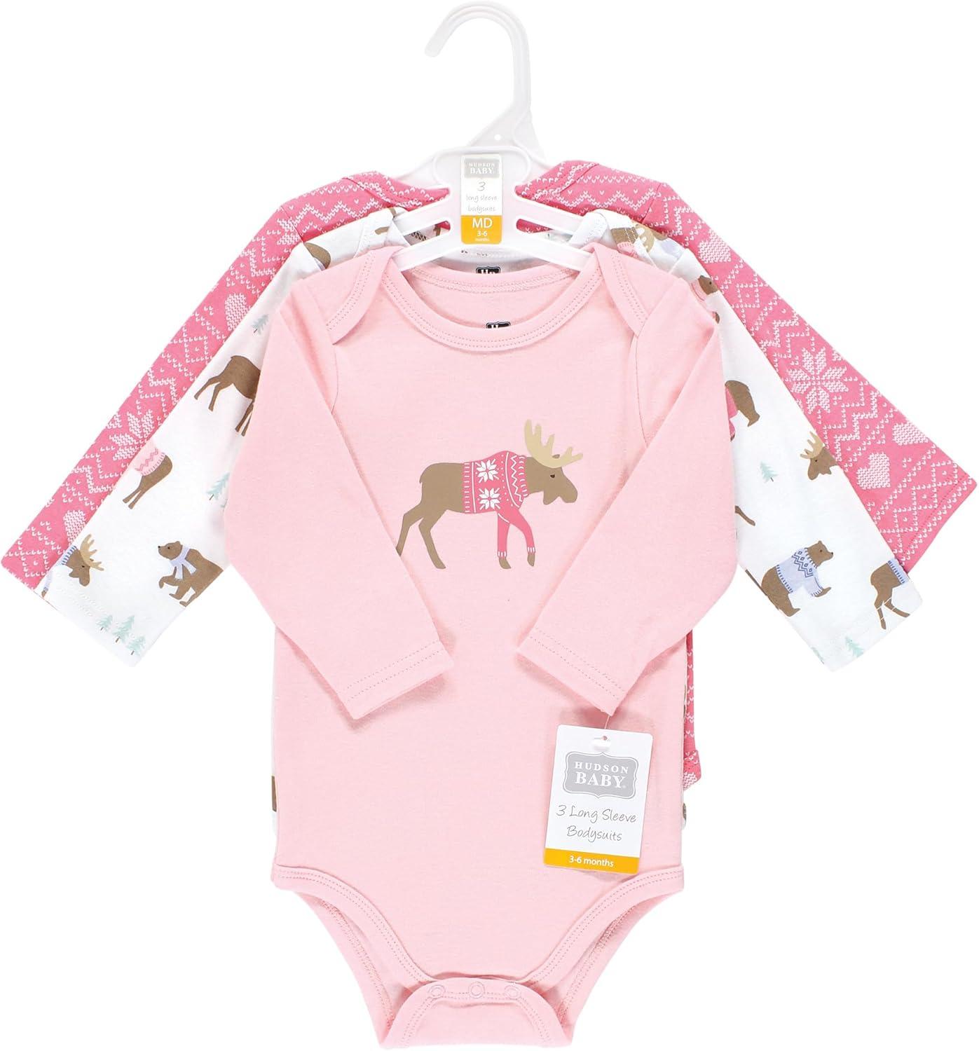Hudson Baby baby-girls Cotton Long-sleeve Bodysuits 3-pack(Pink Moose Bear)