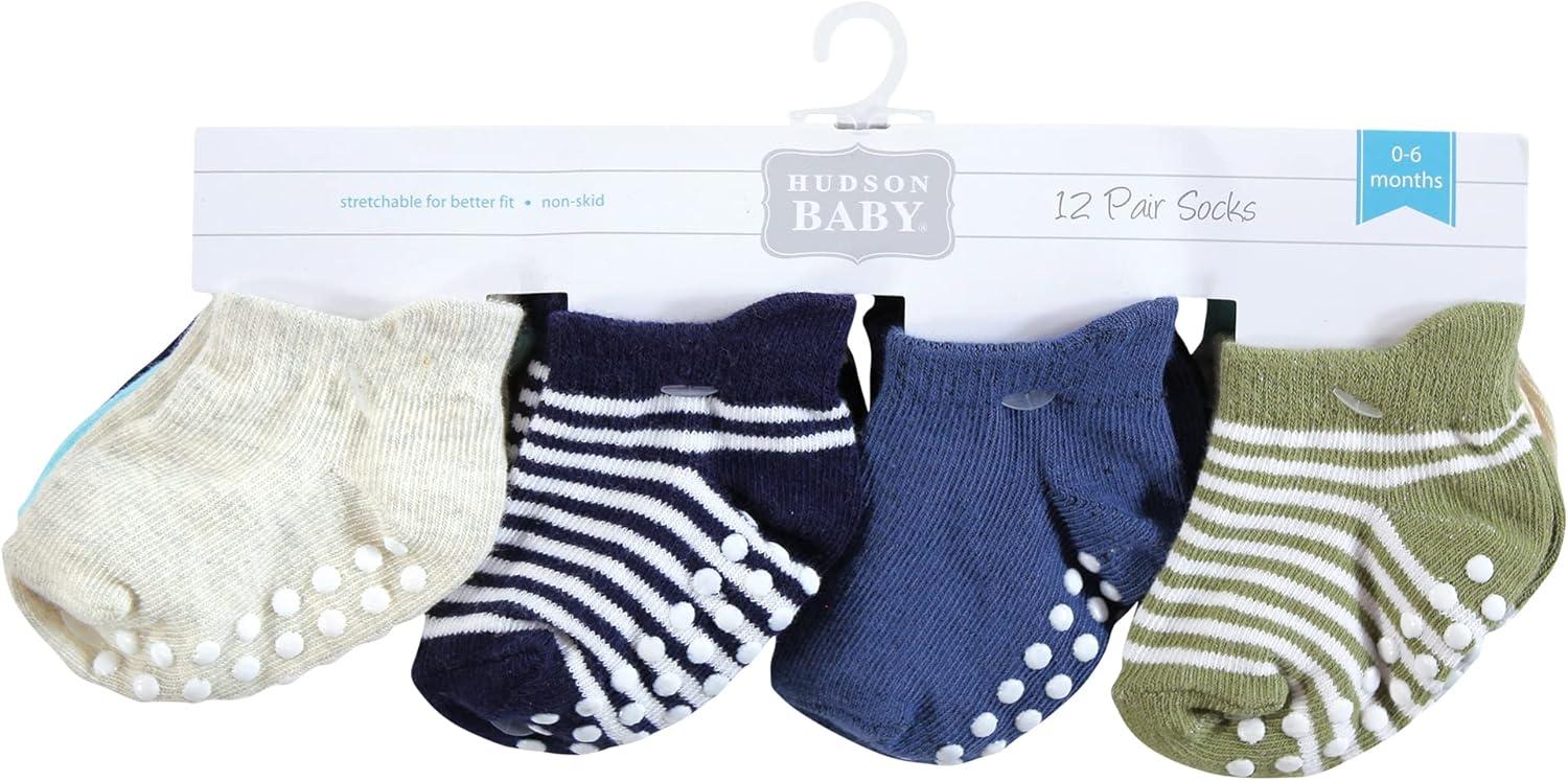 Hudson Baby socks are ideal baby socks for everyday wear with cotton-rich fabric that are soft and comfortable on your baby's tiny little feet. Our stretchable design makes for proper fit and no fuss dressing. Our non-skid grippers are perfect for little ones and toddlers walking and running, helping prevent trips and falls. Made with soft, cushy fabric, our socks are a great addition to your little one's outfit.