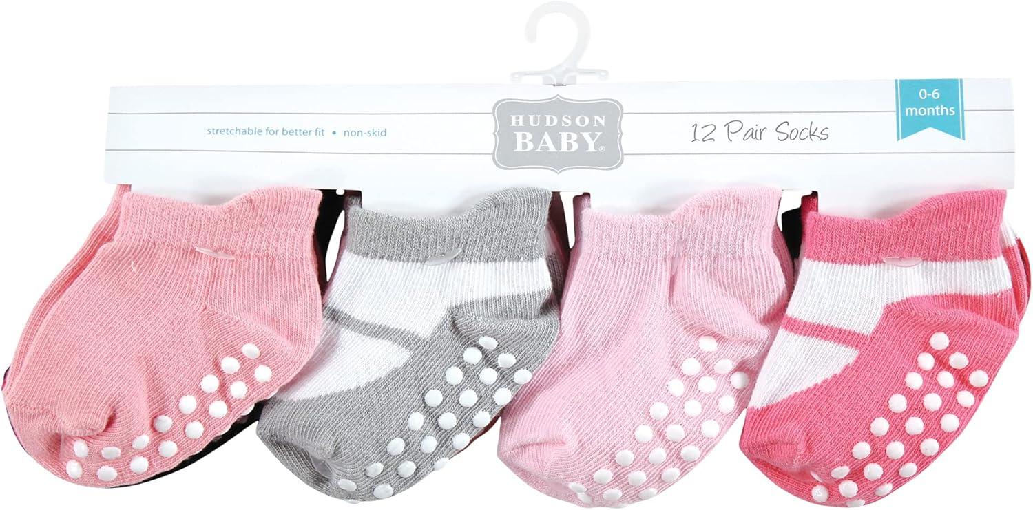 Hudson Baby socks are ideal baby socks for everyday wear with cotton-rich fabric that are soft and comfortable on your baby's tiny little feet. Our stretchable design makes for proper fit and no fuss dressing. Our non-skid grippers are perfect for little ones and toddlers walking and running, helping prevent trips and falls. Made with soft, cushy fabric, our socks are a great addition to your little one's outfit.
