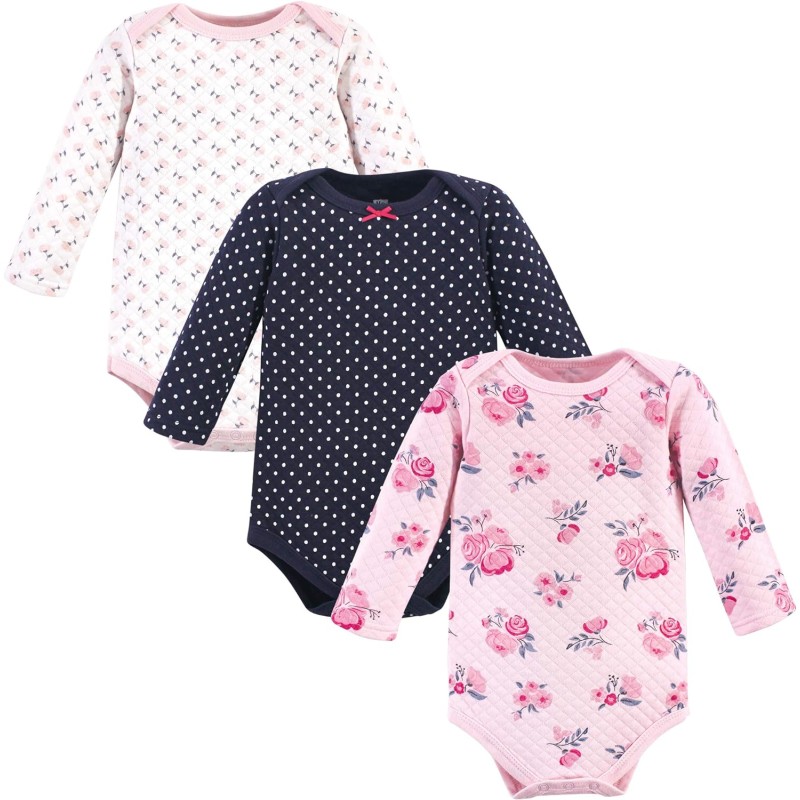 Hudson Baby baby-girls Quilted Long Sleeve Cotton Bodysuits(Pink Navy Floral)