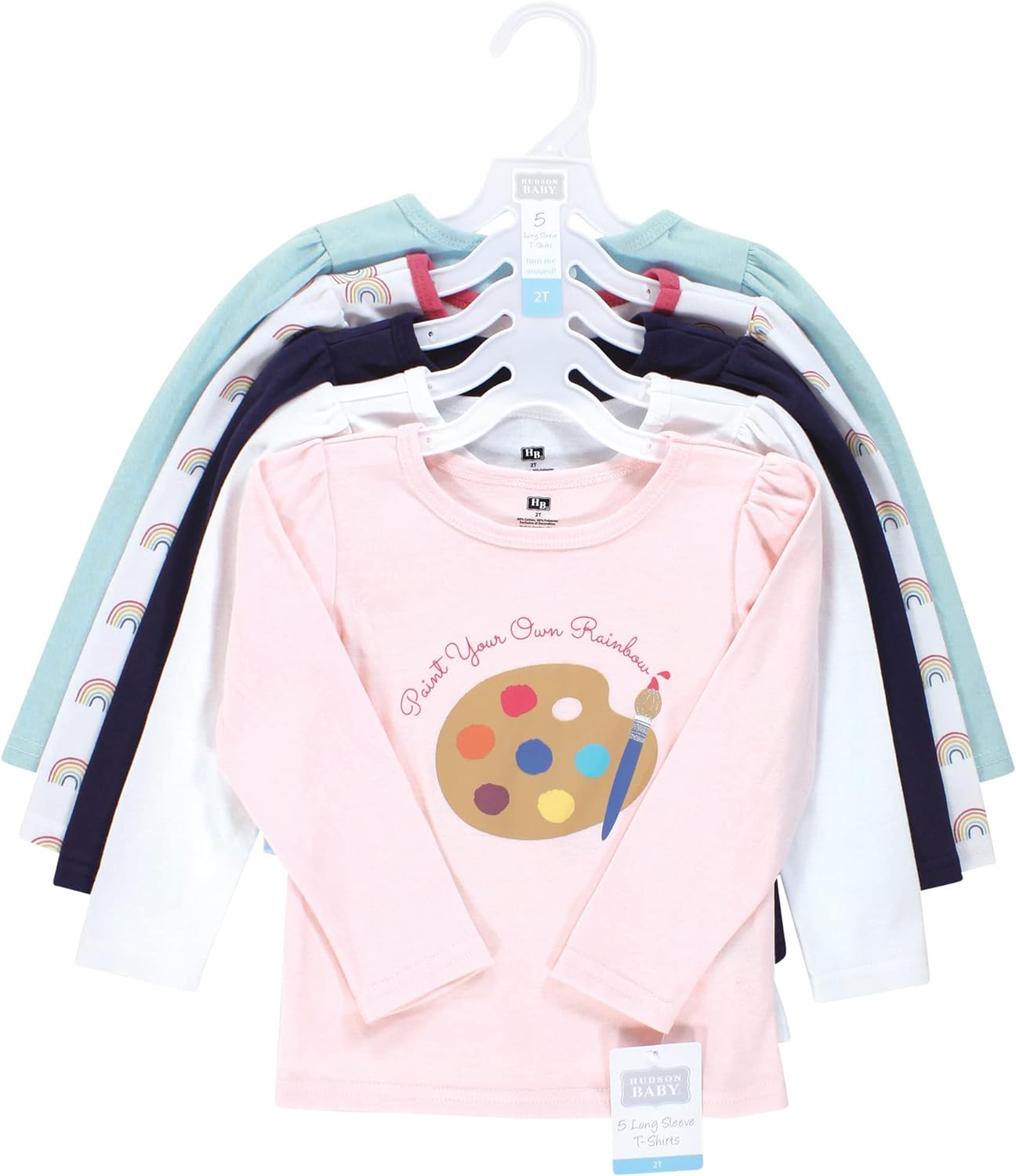 Hudson Baby t-shirts are great everyday tops for your little ones. Featuring fun prints and patterns, our t-shirts are made with comfortable, soft cotton poly fabric that feels wonderful on children's skin. Our sets include five t-shirts so you can mix and match with your child's wardrobe for fun everyday outfits.