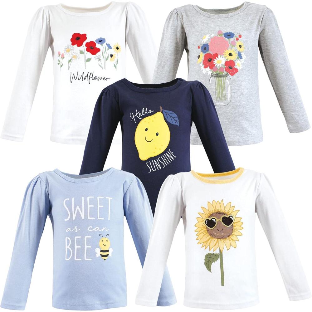 Hudson Baby t-shirts are great everyday tops for your little ones. Featuring fun prints and patterns, our t-shirts are made with comfortable, soft cotton poly fabric that feels wonderful on children's skin. Our sets include five t-shirts so you can mix and match with your child's wardrobe for fun everyday outfits.