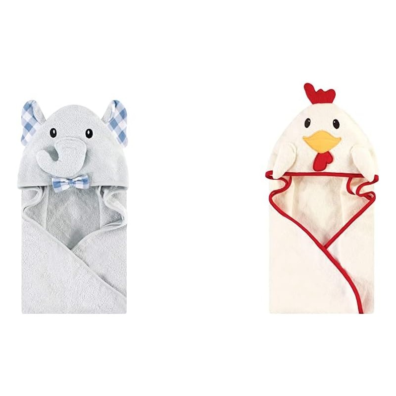 Hudson Baby Boy Animal Face Hooded Towel 2-Pack, Cow Rooster(Gingham Elephant Rooster One Size)
