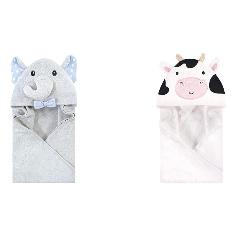 Hudson Baby Boy Animal Face Hooded Towel 2-Pack, Cow Rooster(White Dots Gray Elephant Cow One Size)