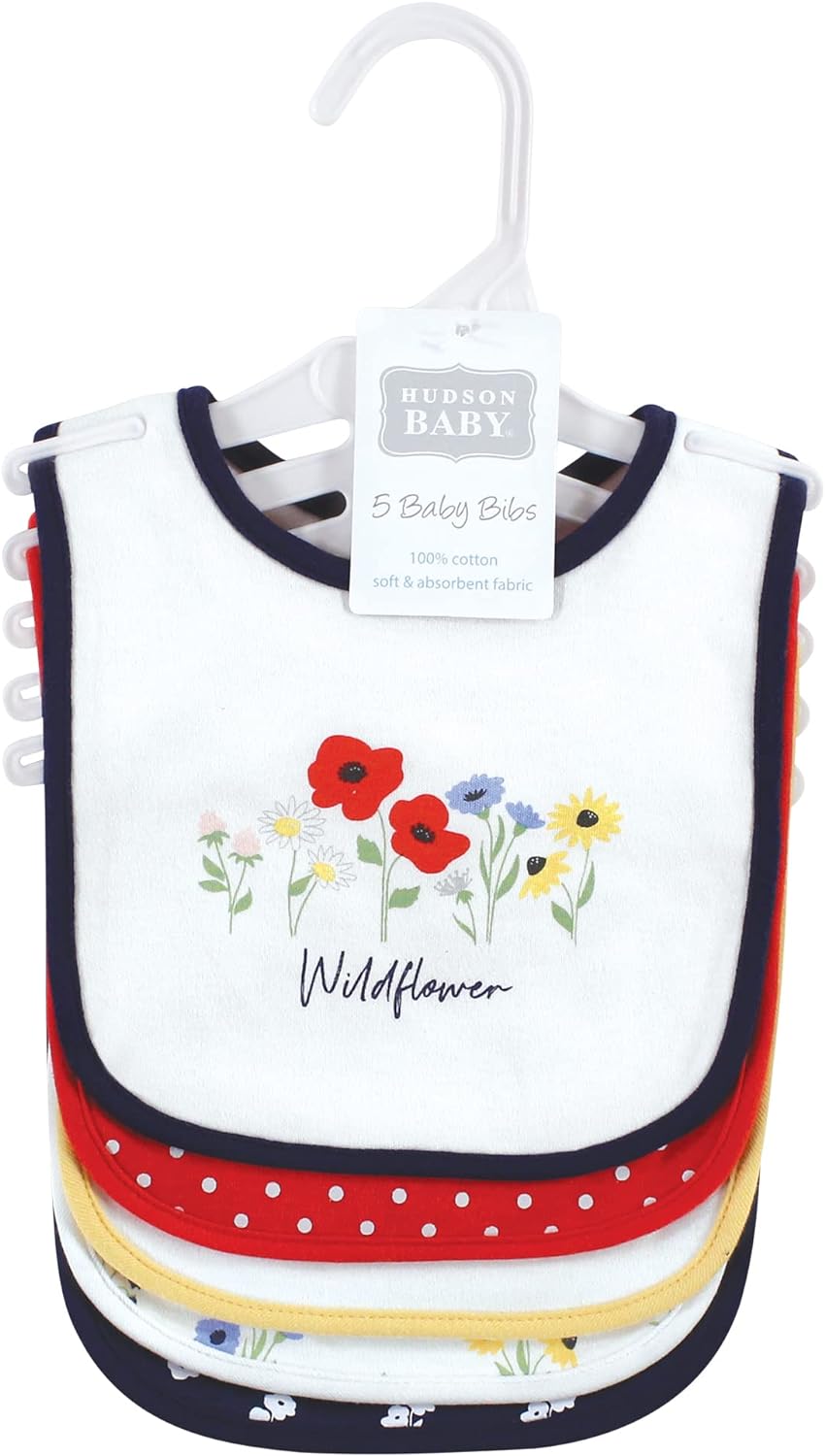 Hudson Baby is a premium baby clothing and accessories line that features better feeding solutions for mom and baby. Hudson Baby 5-Pack soft cotton droller bibs are ideal for catching drool and keeping baby dry. Terry backing helps absorb any liquid and stays off baby's clothes and neck to prevent rashes and clothing changes. Hook and loop closure is easy on baby's skin. Bib is perfect for feedings or all day to catch any drool.