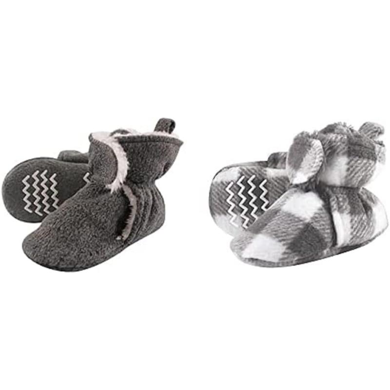 Hudson Baby Cozy Fleece and Sherpa Booties, 2-Pack(Heather Charcoal/Charcoal White Plaid)