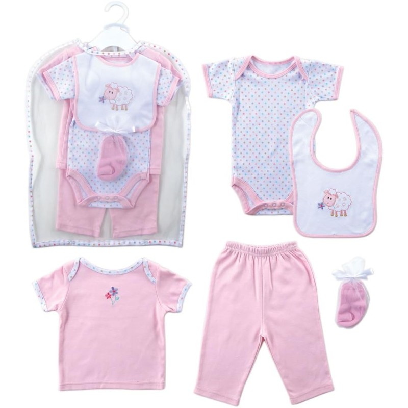 Hudson baby 6-piece gift collections a great gift for a newborn baby. With many baby clothing essentials in matching colors and coordinates these clothes are great together or with other baby wear that you have in your little one's wardrobe. Set includes a bodysuit, tee top, pant, bib, socks and garment bag. Available in 0-3 months size
