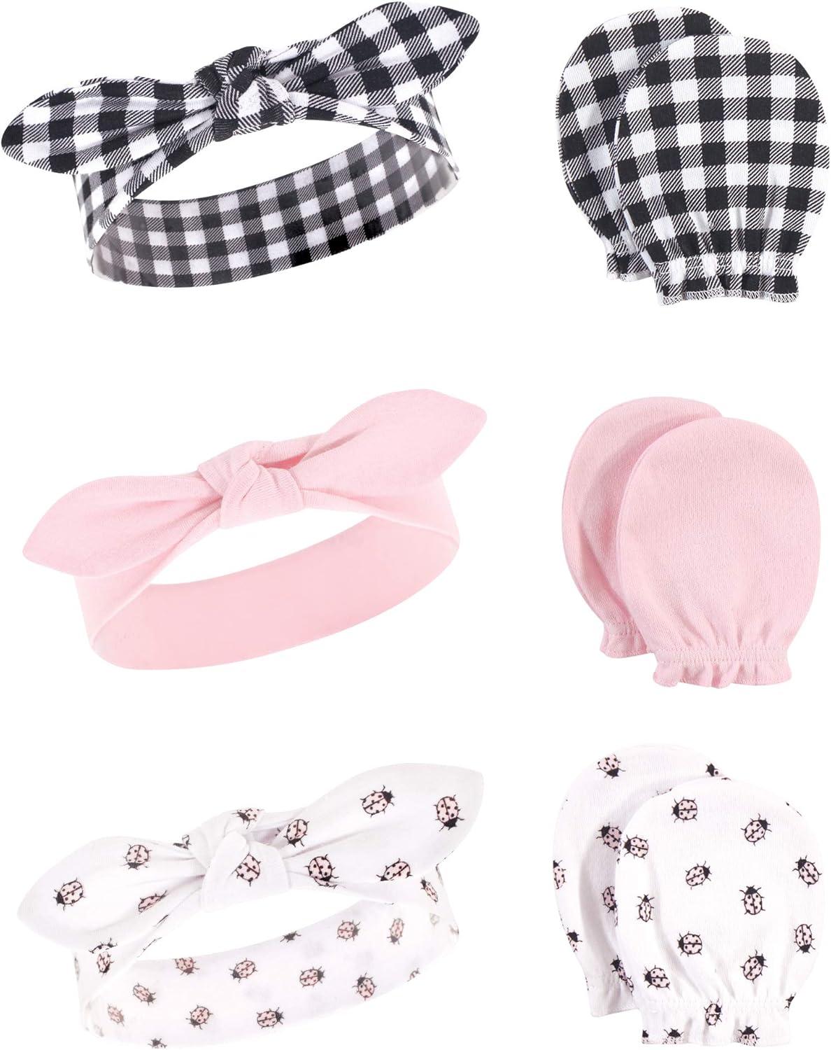 Hudson Baby Girls 12Pc Cotton Headband and Scratch Mitten Set, Lady Bug Xoxo, 0-6 Months(Pink Floral Dots)