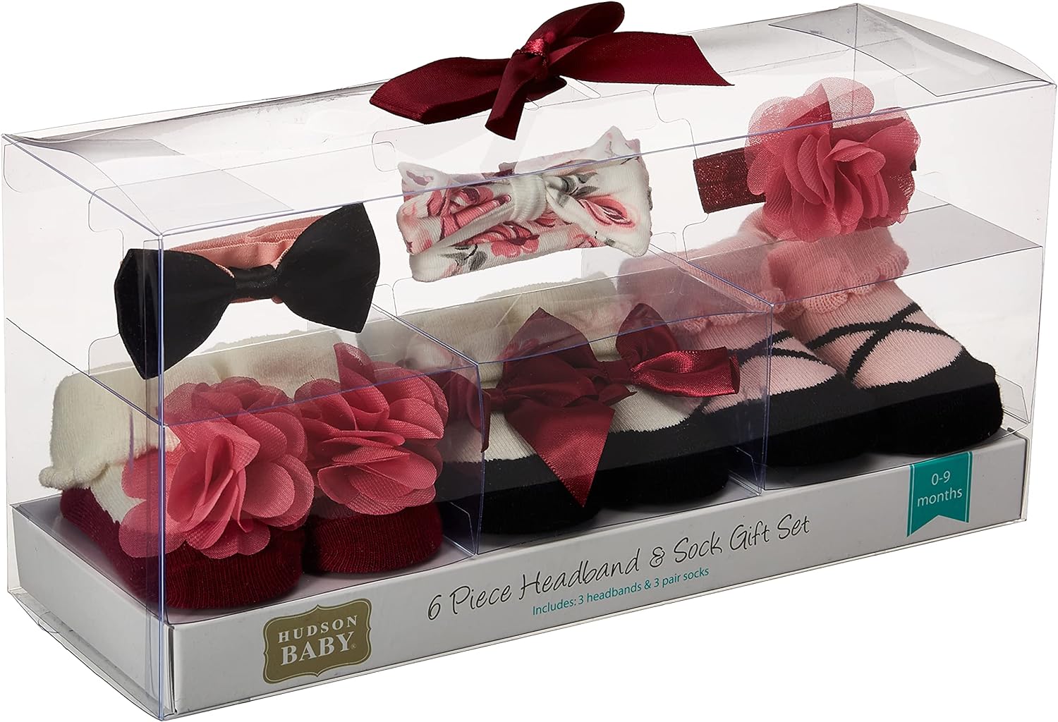 Hudson Baby Girl’s Headband and Socks Giftset(Burgundy Floral 6-piece)