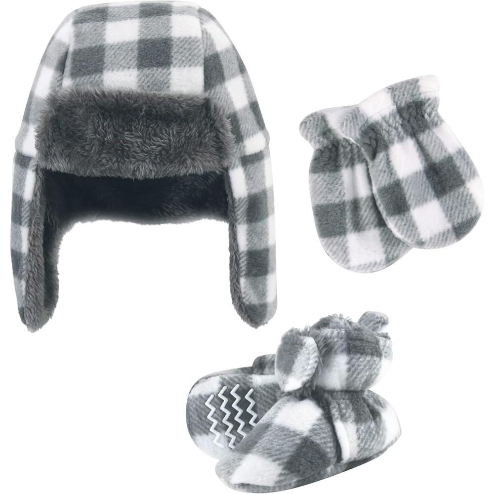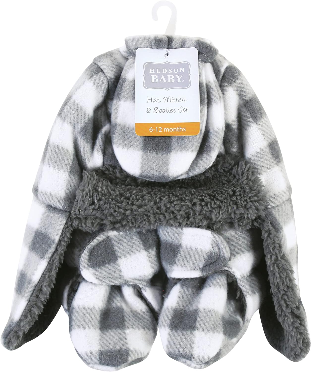 Hudson Baby Girls’ Trapper Hat, Mitten and Bootie Set(Charcoal White Plaid)