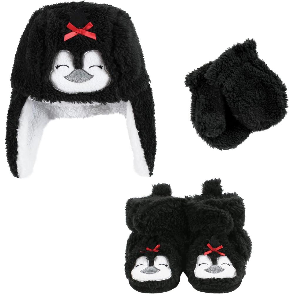 Hudson Baby Girls’ Trapper Hat, Mitten and Bootie Set(Girl Penguin)