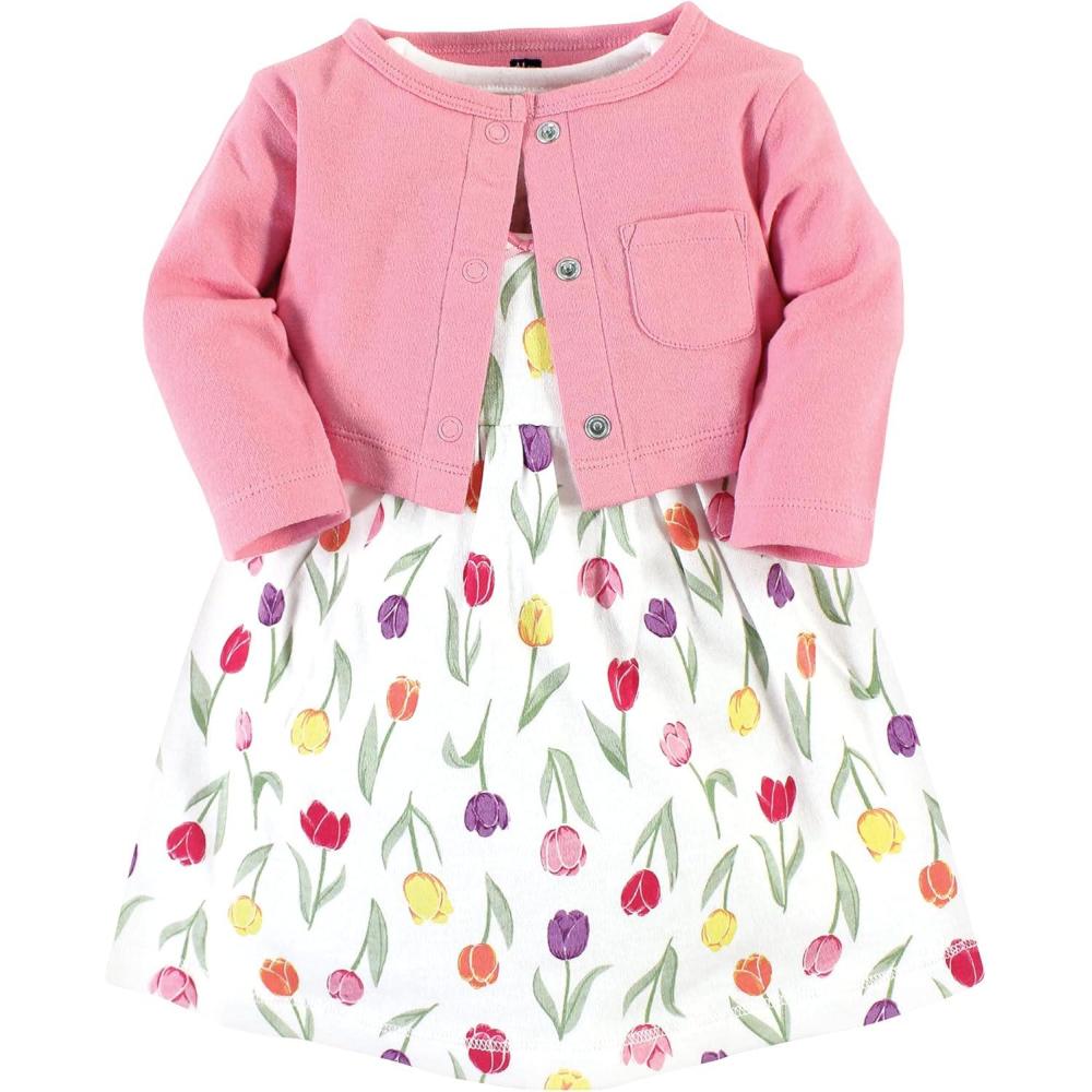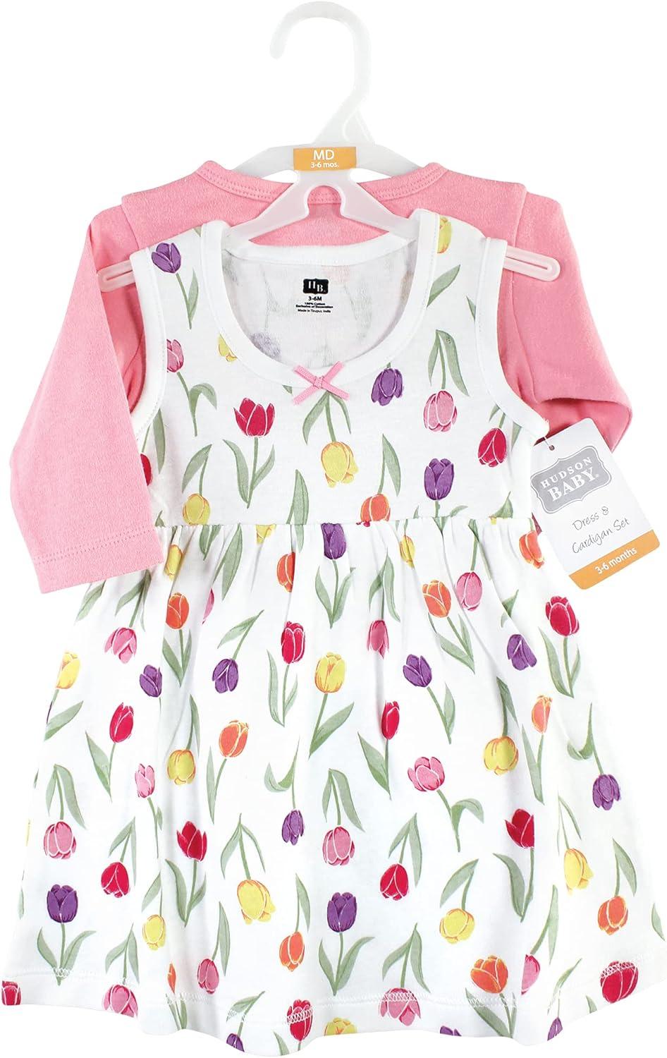 Hudson Baby Infant and Toddler Girls Cotton Dress and Cardigan Set(Spring Tulips)