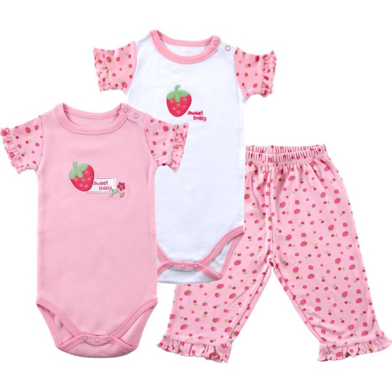 Premium brand Hudson Baby infant clothes are an attractive and stylish way to dress your precious little one. This is made up of 100% combed cotton. These garments are soft to the touch on your baby's skin. This set of 2 bodysuits and matching pants comes with an adorable strawberry themed design under the collection name of sweet baby. The ruffled cuffs add to the classic style. This is available in sizes up to 12 months.