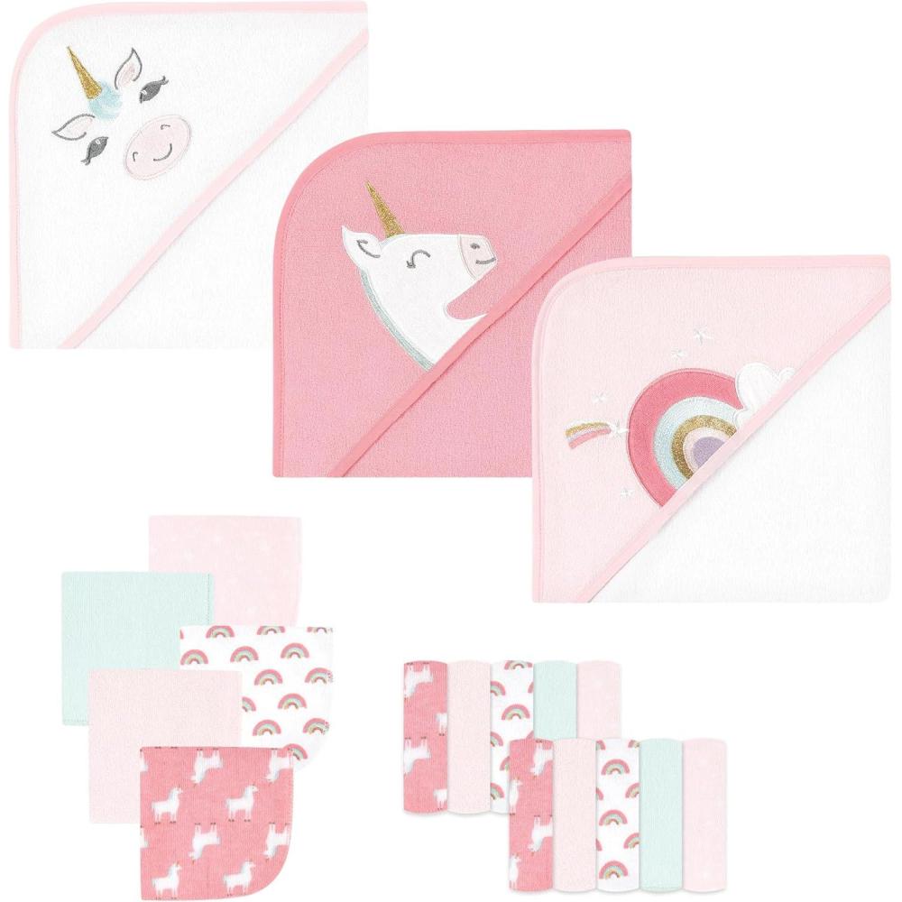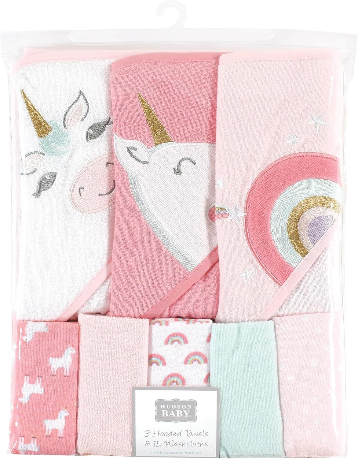 Hudson Baby Unisex Baby Animal Hooded Towel 3pk and 15 Washcloths, Unicorn, One Size(Unicorn)