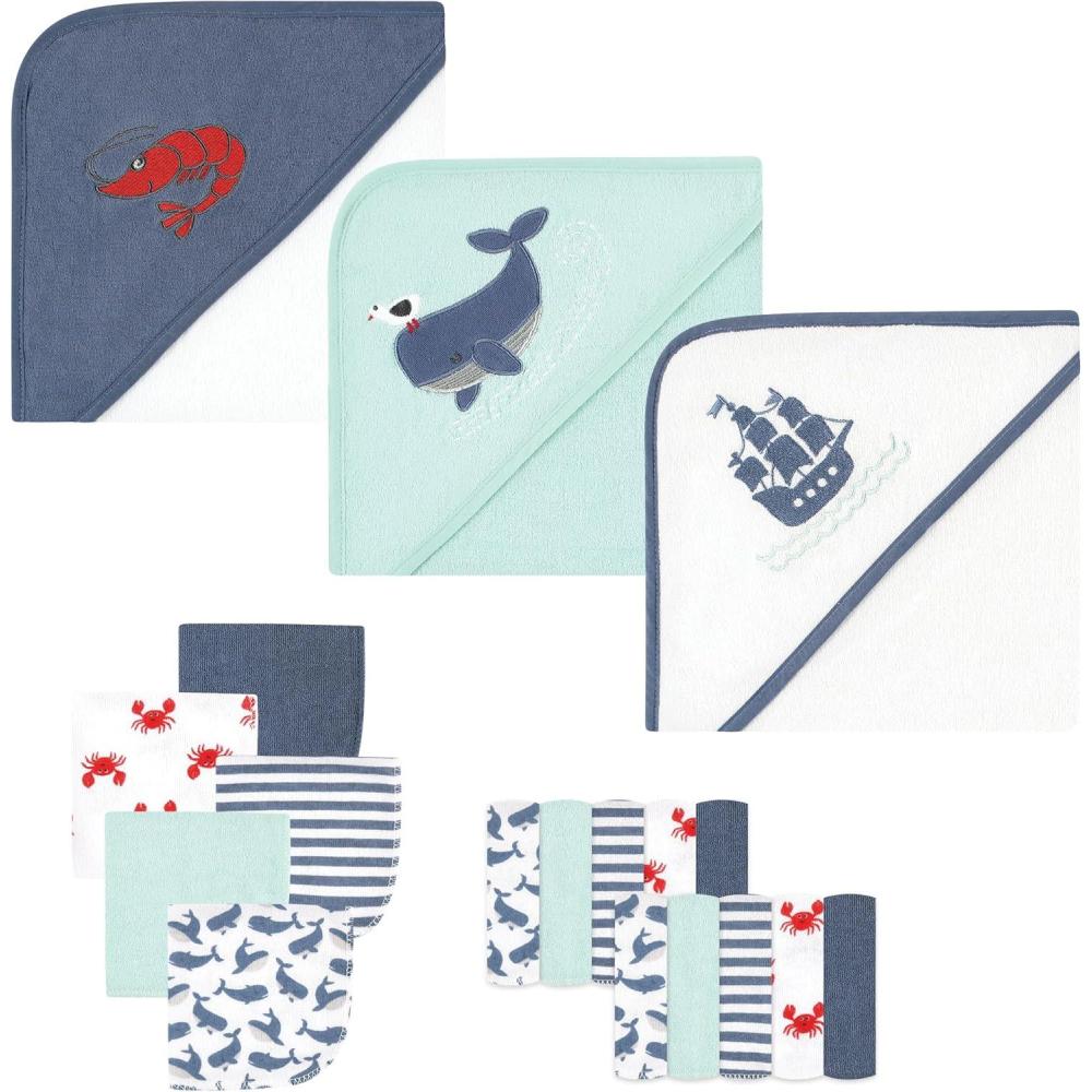 Set includes three hooded towel and fifteen washcloths