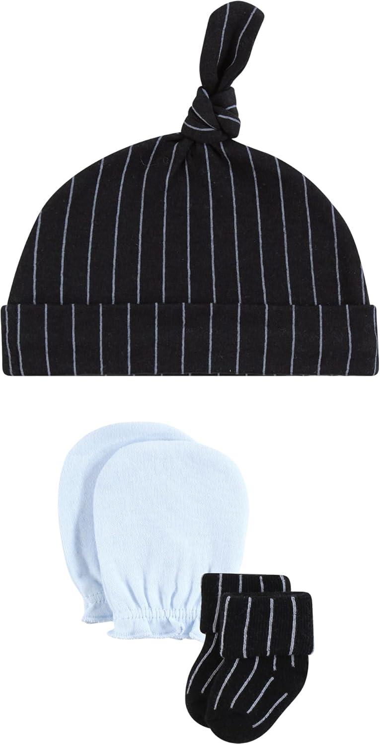 Hudson Baby cotton caps, mittens and socks set is the perfect set for your newborn. Our caps, mittens and socks will help your little one stay warm and matching from head to hands to toes! Mittens and socks have elastic so they stay snug on hands and feet, but not too tight. Our caps feature cute prints and will keep your little one's head cozy and warm. Fits ages 0-6 months.