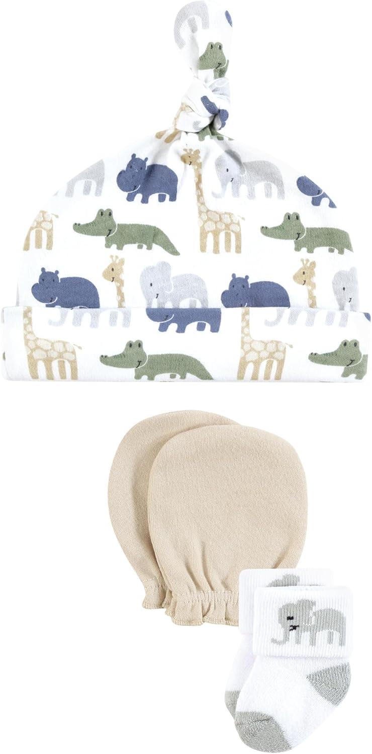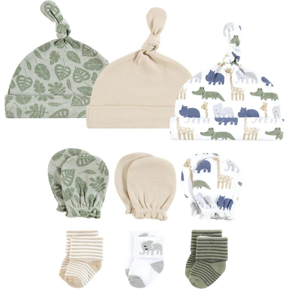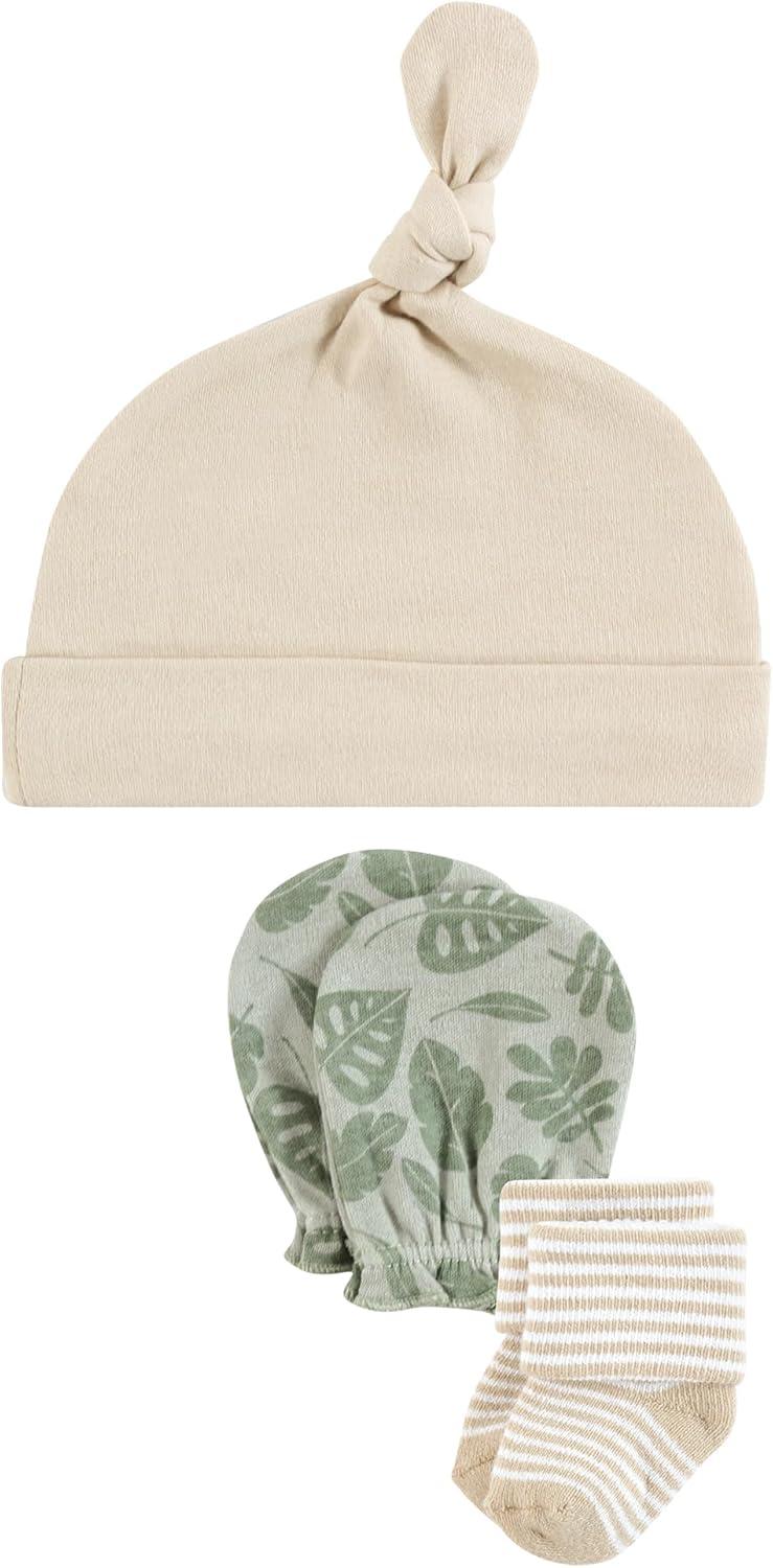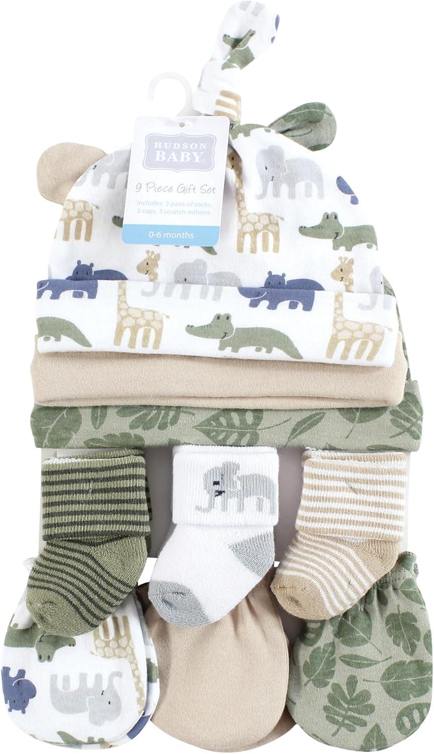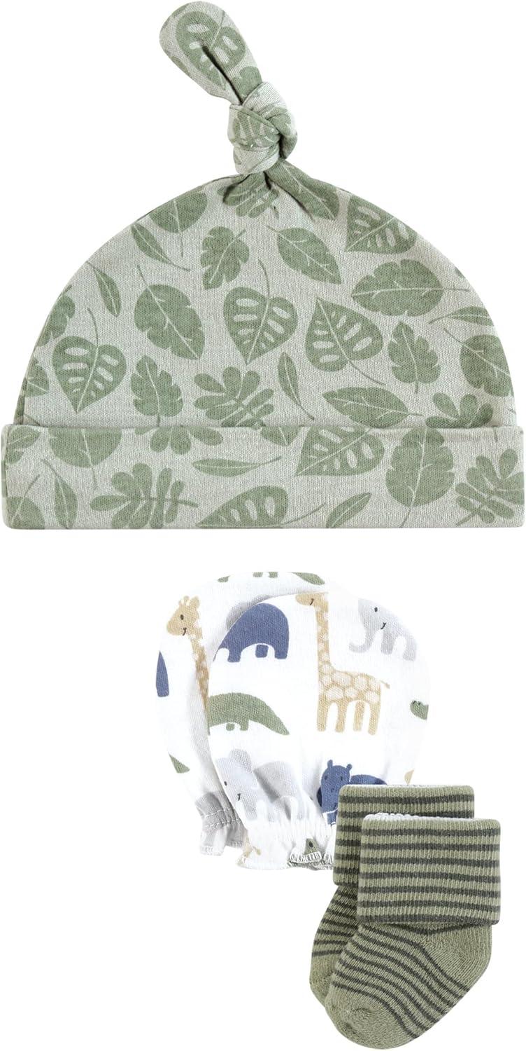 Hudson Baby Unisex Baby Caps, Mittens and Socks Set, 0-6 Months(Wild Leaf Safari)