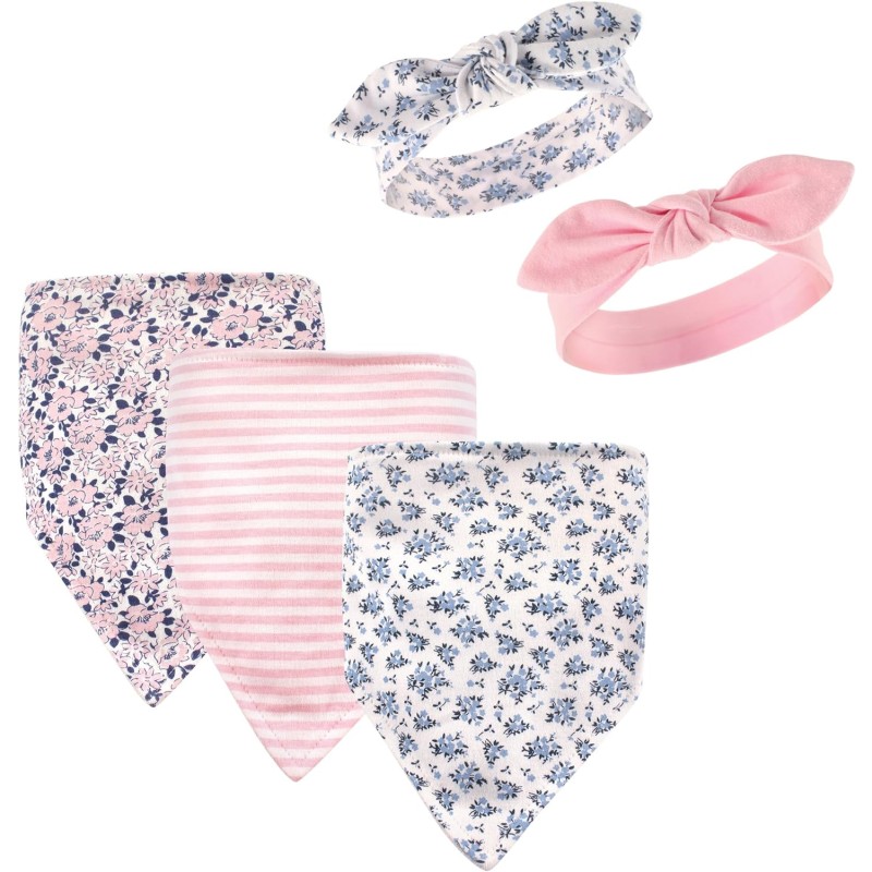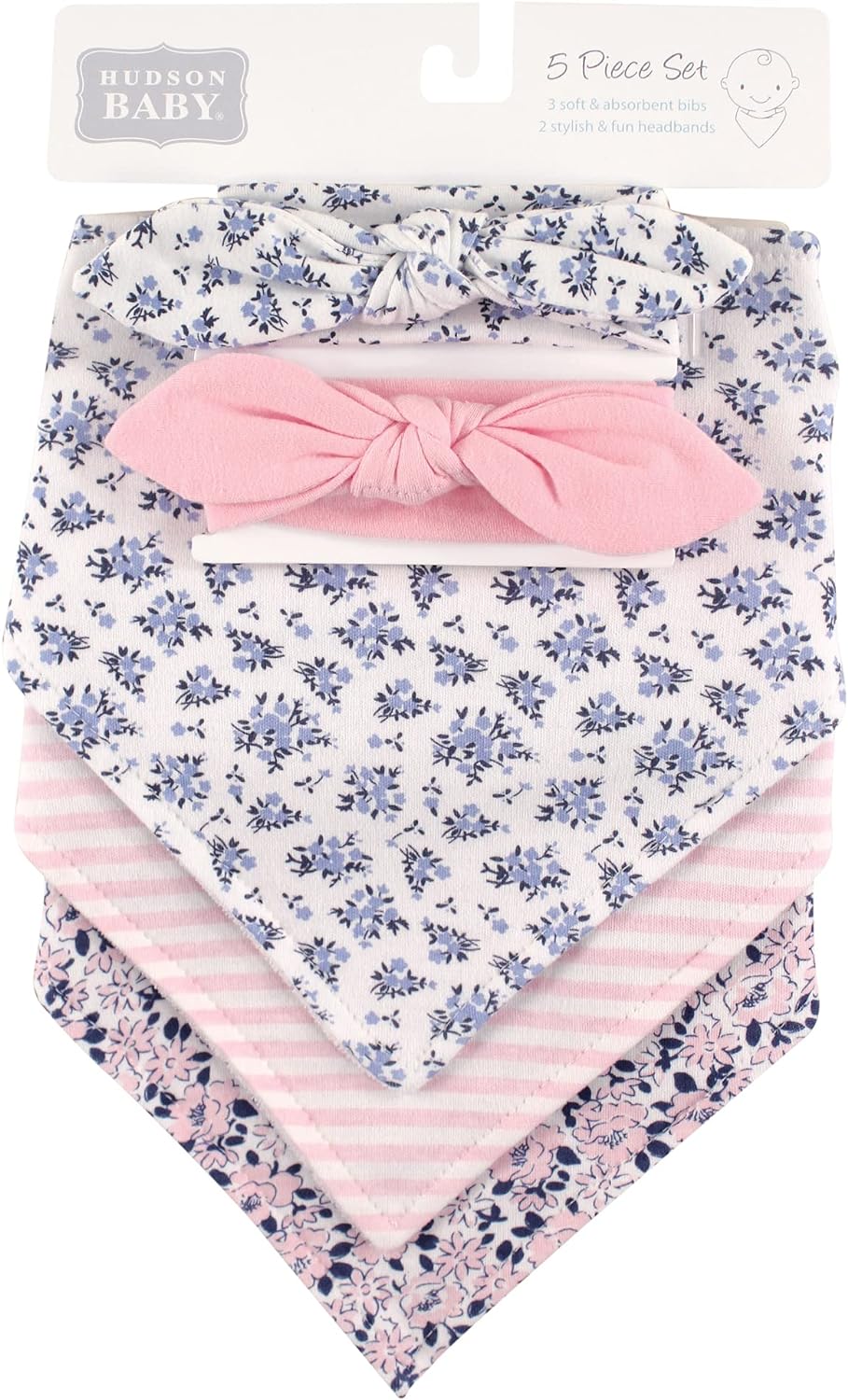 Hudson Baby is a premium baby basics brand featuring stylish clothing, bath and bedding baby essentials. Hudson Baby 5-Pack Bandana Bibs & Headband Set are an adorable set for moms looking for fashionable matching bandana bibs and headbands and a great baby shower gift. Each set features three bandana bibs and two headbands with bibs made of cotton-poly blend and headbands made of cotton and spandex. Each set features coordinated prints and patterns. Ideal for ages 0 months to 9 months.
