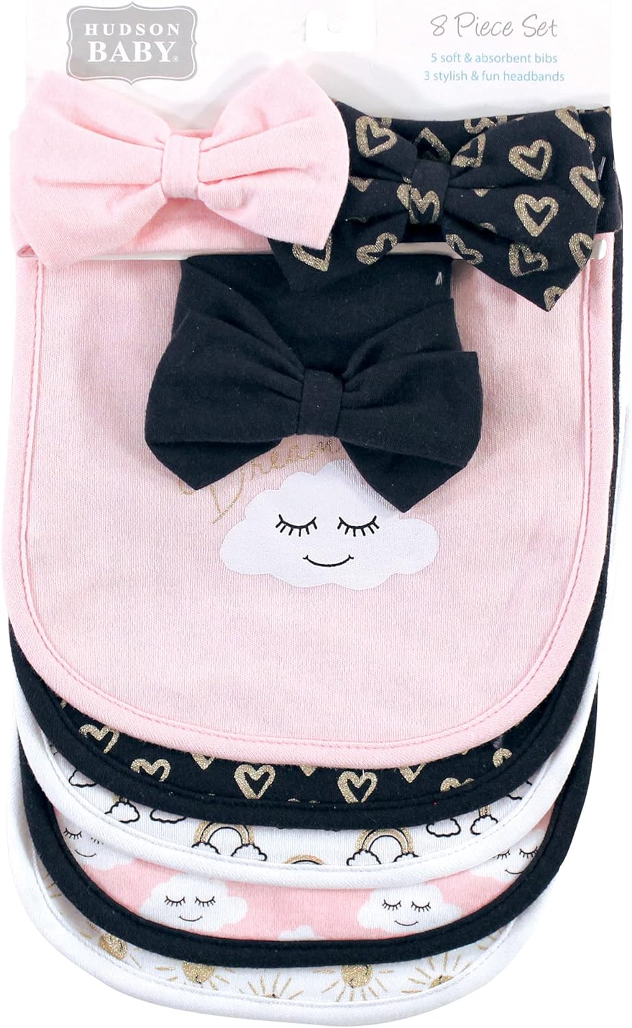 Hudson Baby is a premium baby basics brand featuring stylish clothing, bath and bedding baby essentials. Hudson Baby 5-Pack Bandana Bibs & Headband Set are an adorable set for moms looking for fashionable matching bandana bibs and headbands and a great baby shower gift. Each set features three bandana bibs and two headbands with bibs made of cotton-poly blend and headbands made of cotton and spandex. Each set features coordinated prints and patterns. Ideal for ages 0 months to 9 months.