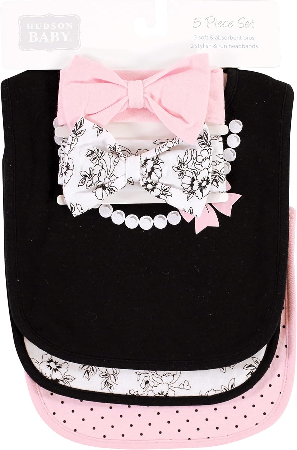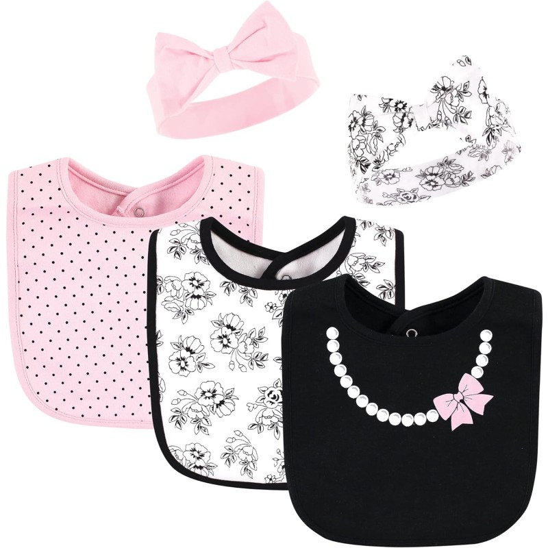 Hudson Baby is a premium baby basics brand featuring stylish clothing, bath and bedding baby essentials. Hudson Baby 5-Pack Bandana Bibs & Headband Set are an adorable set for moms looking for fashionable matching bandana bibs and headbands and a great baby shower gift. Each set features three bandana bibs and two headbands with bibs made of cotton-poly blend and headbands made of cotton and spandex. Each set features coordinated prints and patterns. Ideal for ages 0 months to 9 months.