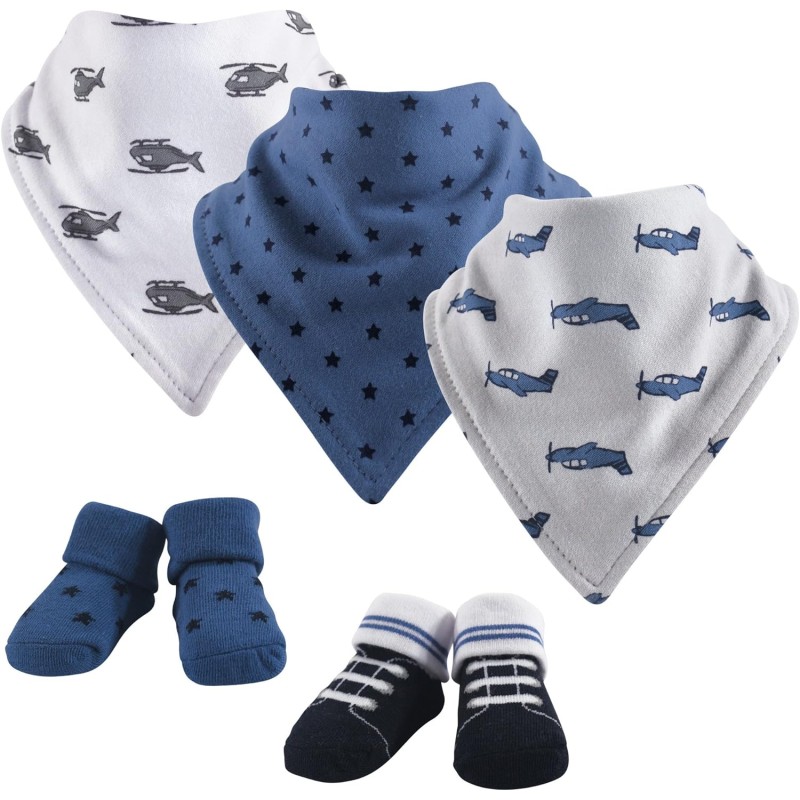 Hudson Baby is a premium baby basics brand featuring stylish clothing, bath and bedding baby essentials. Hudson Baby 5-Pack Bandana Bibs & Socks Set are an adorable set for moms looking for fashionable matching bandana bibs and socks and a great baby shower gift. Each set features three bandana bibs and two socks with bibs made of cotton-poly blend and socks made of cotton, nylon and spandex. Each set features coordinated prints and patterns. Ideal for ages 0 months to 9 months.