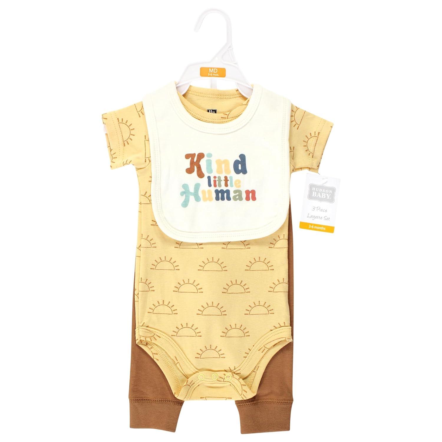 Hudson Baby layette clothing set features a bodysuit, pant, and bib. Our adorable outfit can be used at home or when on the go. Our set also makes a great shower gift. Coordinate and mix and match pieces to create the perfect look for your baby.