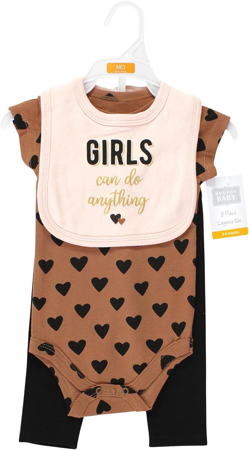 Hudson Baby layette clothing set features a bodysuit, pant, and bib. Our adorable outfit can be used at home or when on the go. Our set also makes a great shower gift. Coordinate and mix and match pieces to create the perfect look for your baby.