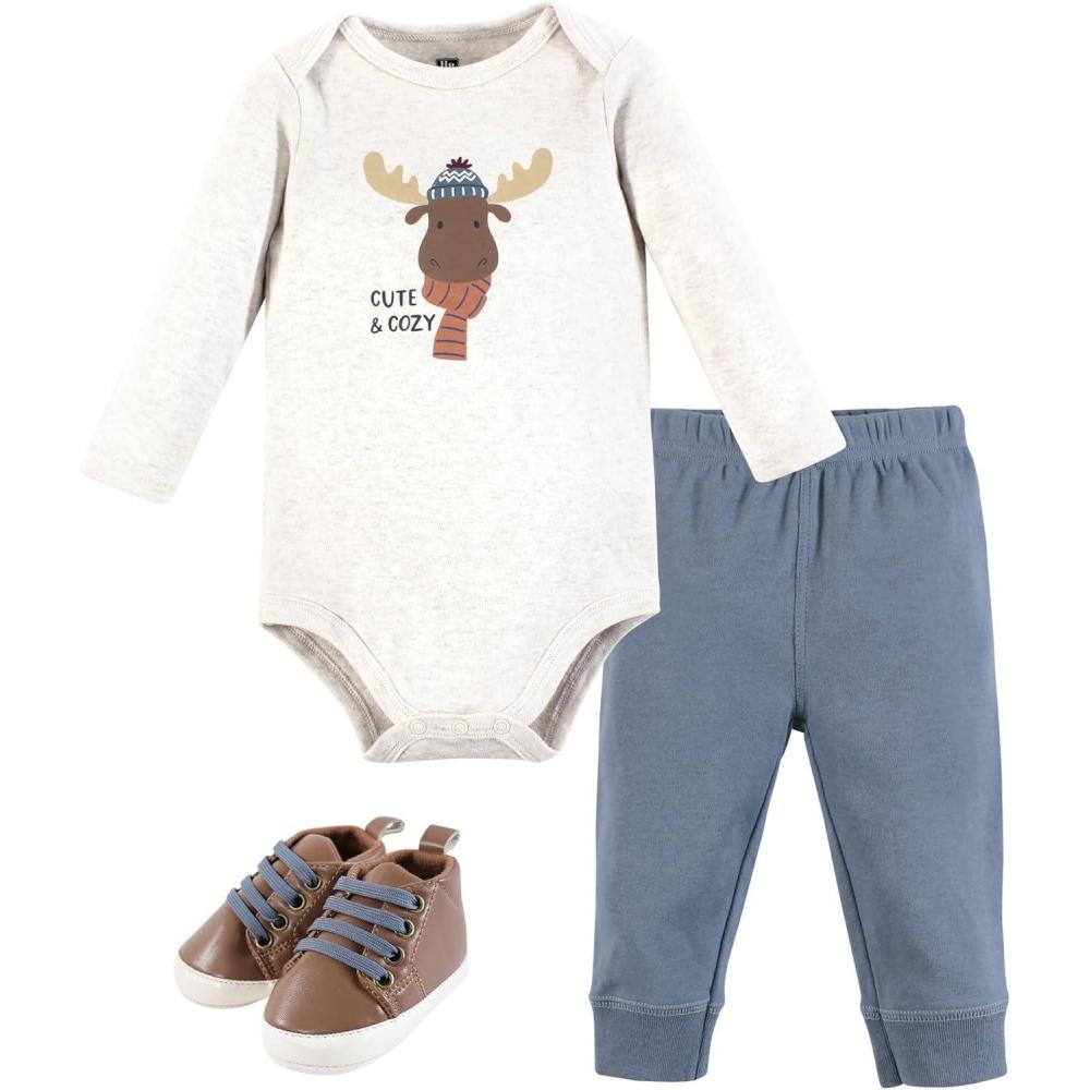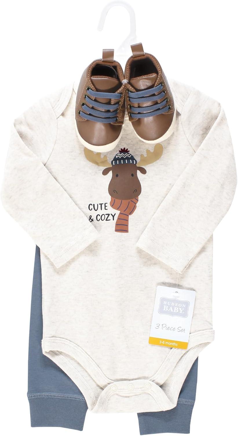Hudson Baby Unisex Baby Cotton Bodysuit, Pant and Shoe Set(Cozy Woodland Moose)