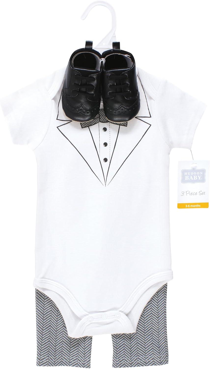 Hudson Baby Unisex Baby Cotton Bodysuit, Pant and Shoe Set(Tweed Tux)