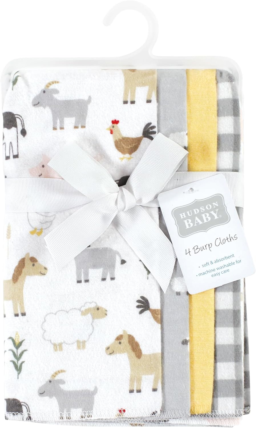 Hudson Baby Unisex Baby Cotton Flannel Burp Cloths 4-Pack, Farm Friends Grey, One Size(One Size Cute Farm 4-pack)