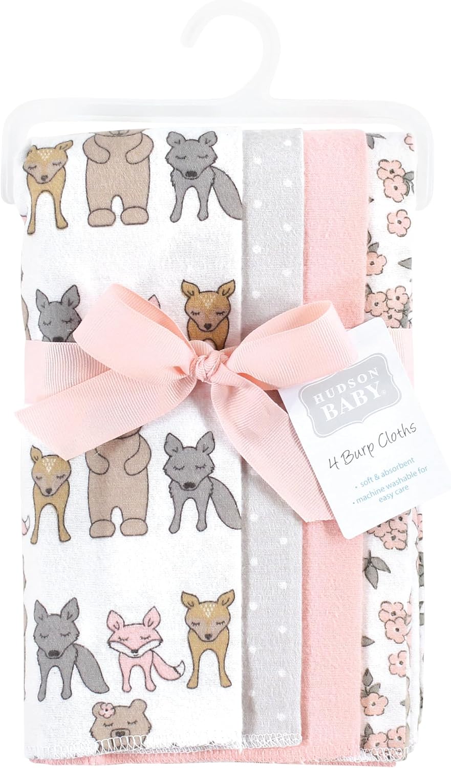 Hudson Baby Unisex Baby Cotton Flannel Burp Cloths 4-Pack, Farm Friends Grey, One Size(One Size Wild Forest Pink 4-pack)