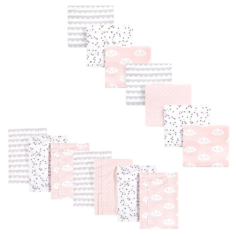 Hudson Baby Unisex Baby Cotton Flannel Burp Cloths and Receiving Blankets, 14-Piece, Space, One Size(One Size Pink Clouds)