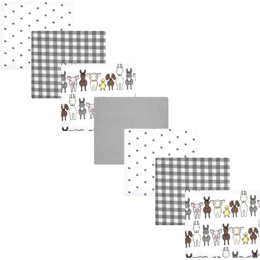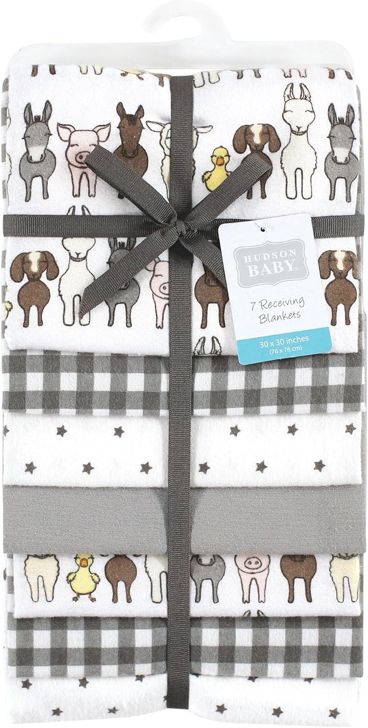 Hudson Baby Unisex Baby Cotton Flannel Receiving Blankets Bundle, Mustache Hat, One Size(Farm Friends Grey)