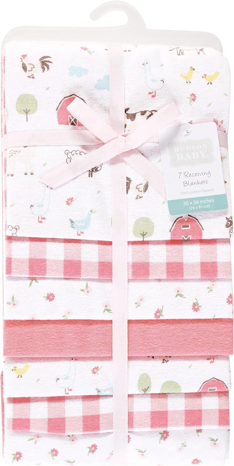 Hudson Baby Unisex Baby Cotton Flannel Receiving Blankets Bundle, Mustache Hat, One Size(Girl Farm Animals)