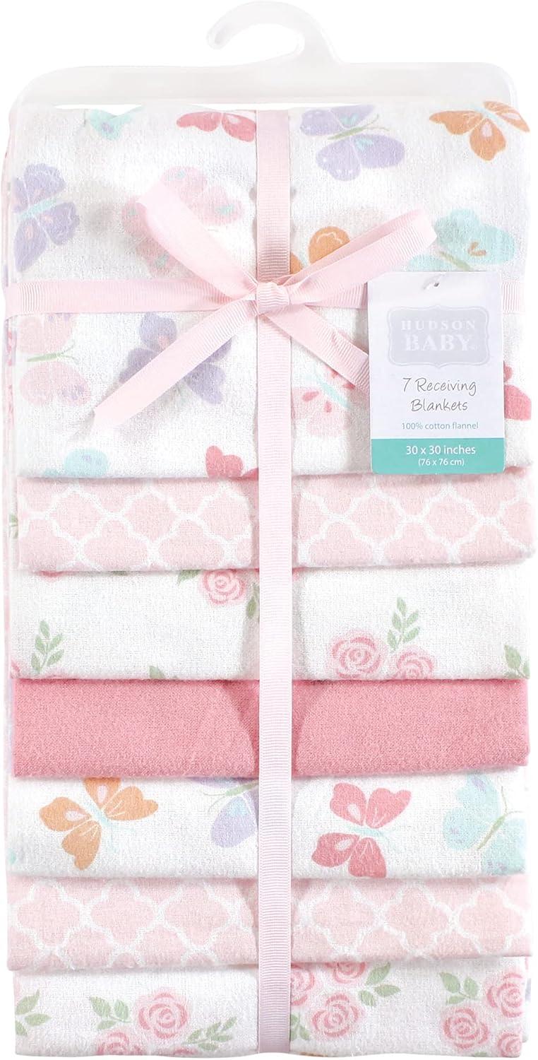Hudson Baby Unisex Baby Cotton Flannel Receiving Blankets Bundle, Mustache Hat, One Size(Pastel Butterfly)