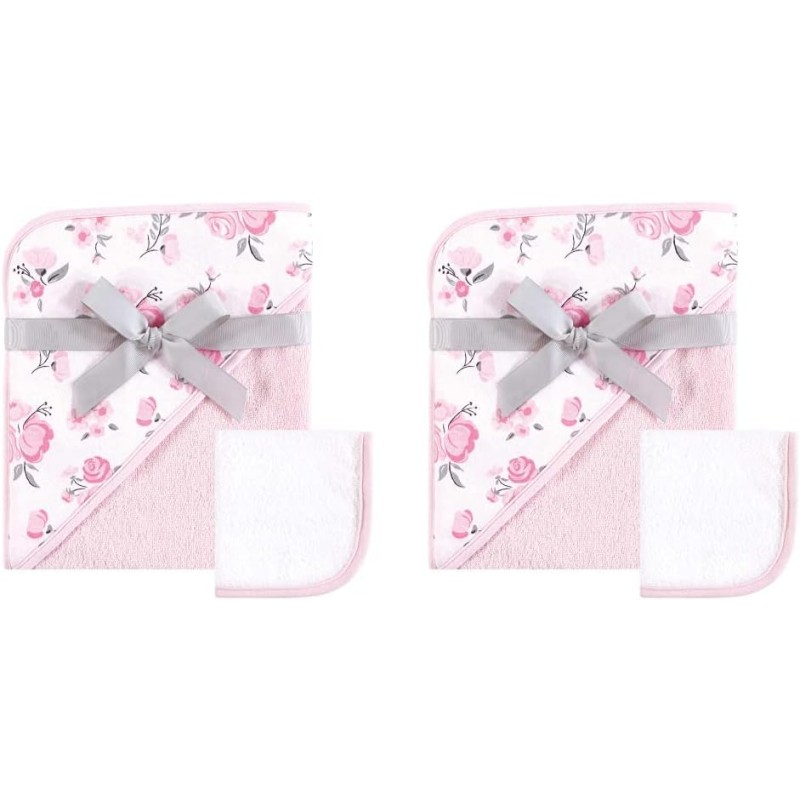 Hudson Baby Unisex Baby Cotton Hooded Towel and Washcloth, Pink Floral, One Size (Pack of 2)(Pink Floral One Size (Pack of 2))