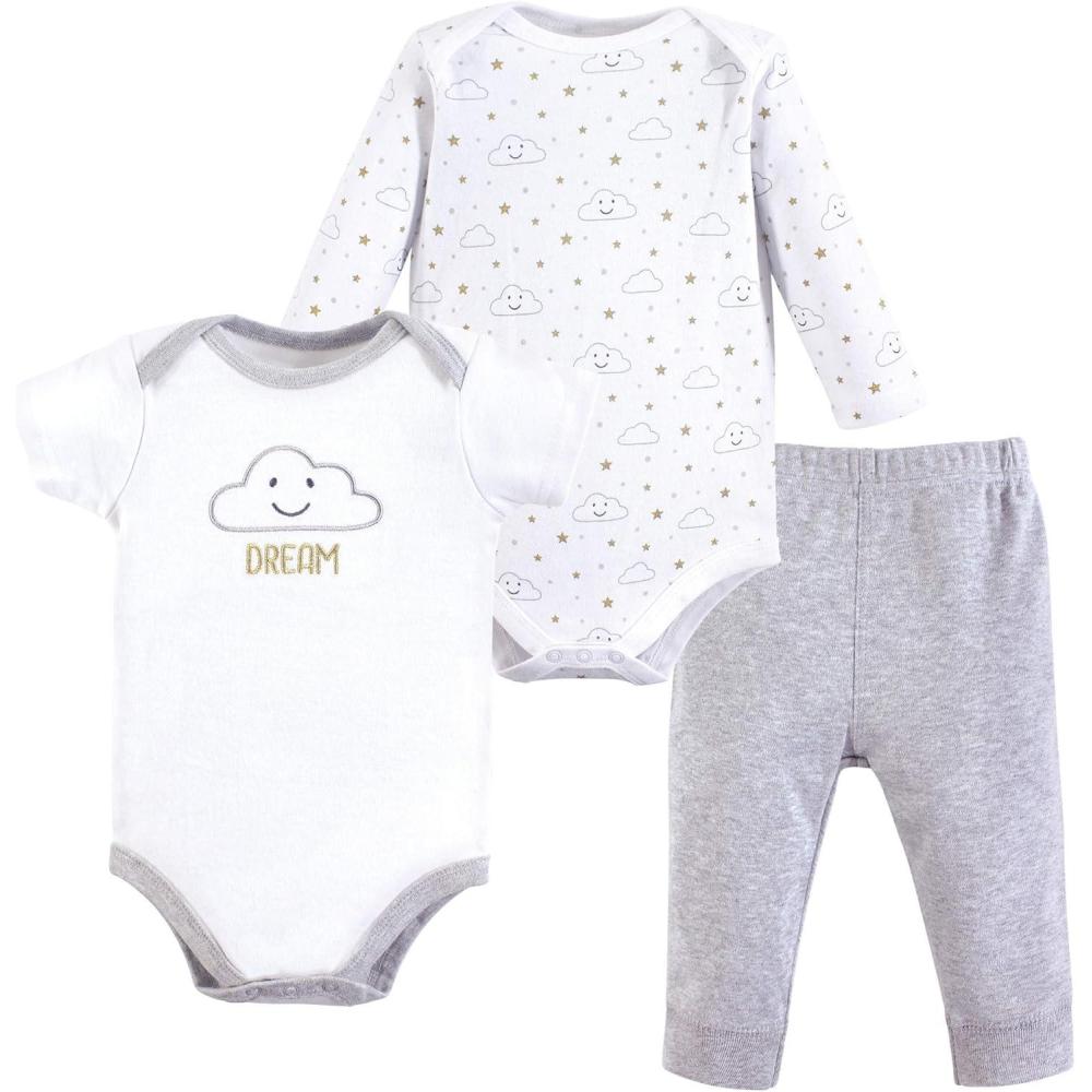 Hudson Baby premium layette collection of high quality cute baby clothing features 100% premium cotton for the softest touch on your baby's gentle skin. This short sleeve and long sleeve bodysuit with pant set is perfect for cooler weather! Bodysuits have stretchable neck opening to go over baby's head easily. Pants can match either bodysuit. Clothing is made of 100% super soft cotton and durable for everyday wear.