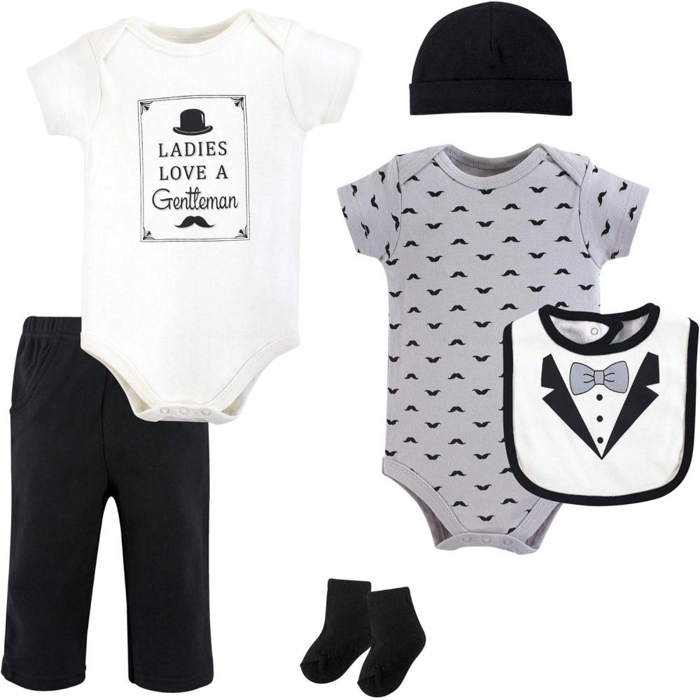 Hudson Baby baby boy's and baby girl's 6 piece layette set includes 2 bodysuits, 1 pair of pants, 1 bib, 1 pair of socks and 1 cotton cap. This mix and match outfit make adorable and trendy options for your little one's wardrobe. Bodysuit, pants and cap are made of 100% super soft cotton, while bib is made of cotton blend to help catch and absorb any drools or spills! Socks are also a cotton blend to stretch with baby's growing feet! Bodysuits have snap closures to make dressing time a breeze. These sets make the perfect baby shower gift!