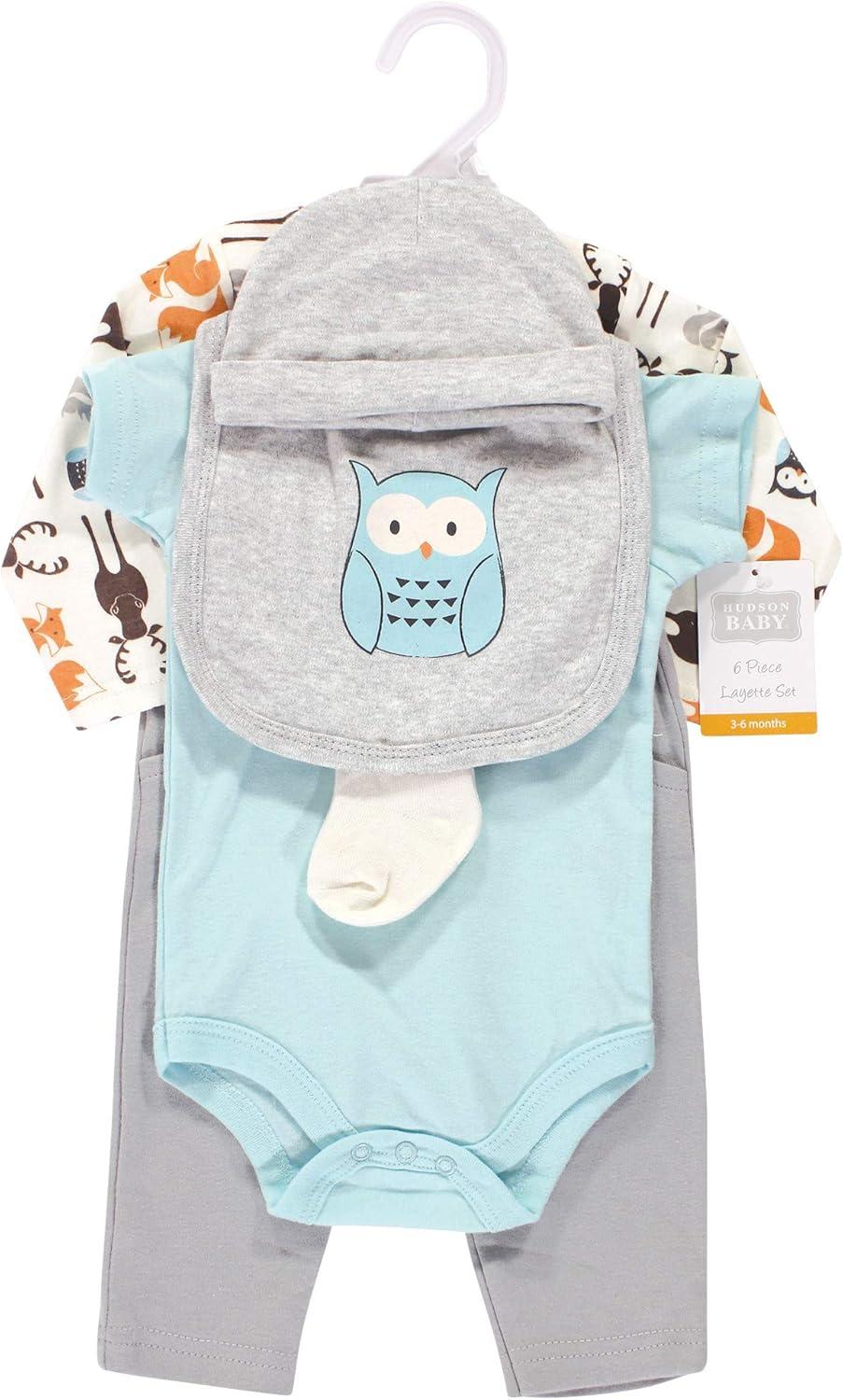 Hudson Baby baby boy's and baby girl's 6 piece layette set includes 2 bodysuits, 1 pair of pants, 1 bib, 1 pair of socks and 1 cotton cap. This mix and match outfit make adorable and trendy options for your little one's wardrobe. Bodysuit, pants and cap are made of 100% super soft cotton, while bib is made of cotton blend to help catch and absorb any drools or spills! Socks are also a cotton blend to stretch with baby's growing feet! Bodysuits have snap closures to make dressing time a breeze. These sets make the perfect baby shower gift!