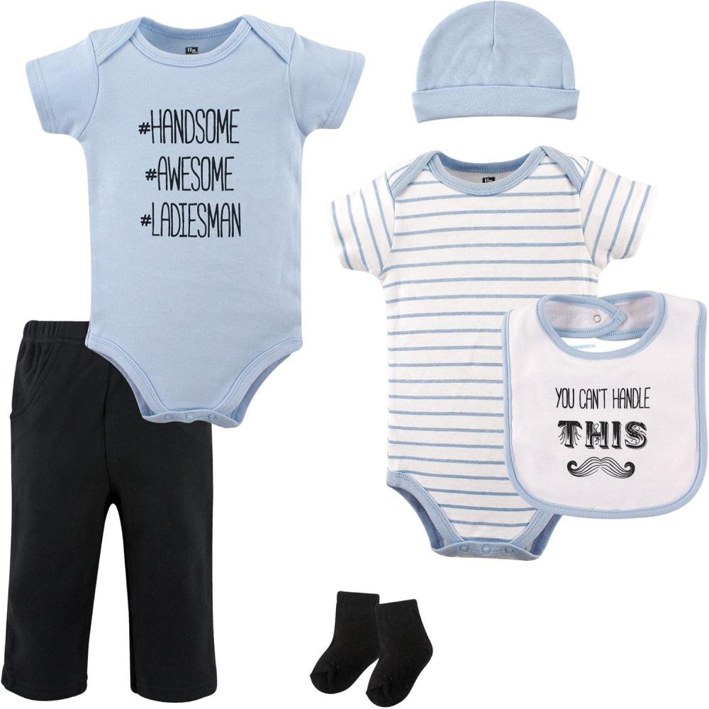 Hudson Baby baby boy's and baby girl's 6 piece layette set includes 2 bodysuits, 1 pair of pants, 1 bib, 1 pair of socks and 1 cotton cap. This mix and match outfit make adorable and trendy options for your little one's wardrobe. Bodysuit, pants and cap are made of 100% super soft cotton, while bib is made of cotton blend to help catch and absorb any drools or spills! Socks are also a cotton blend to stretch with baby's growing feet! Bodysuits have snap closures to make dressing time a breeze. These sets make the perfect baby shower gift!