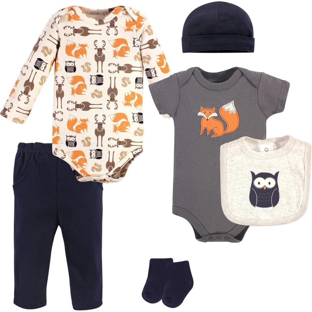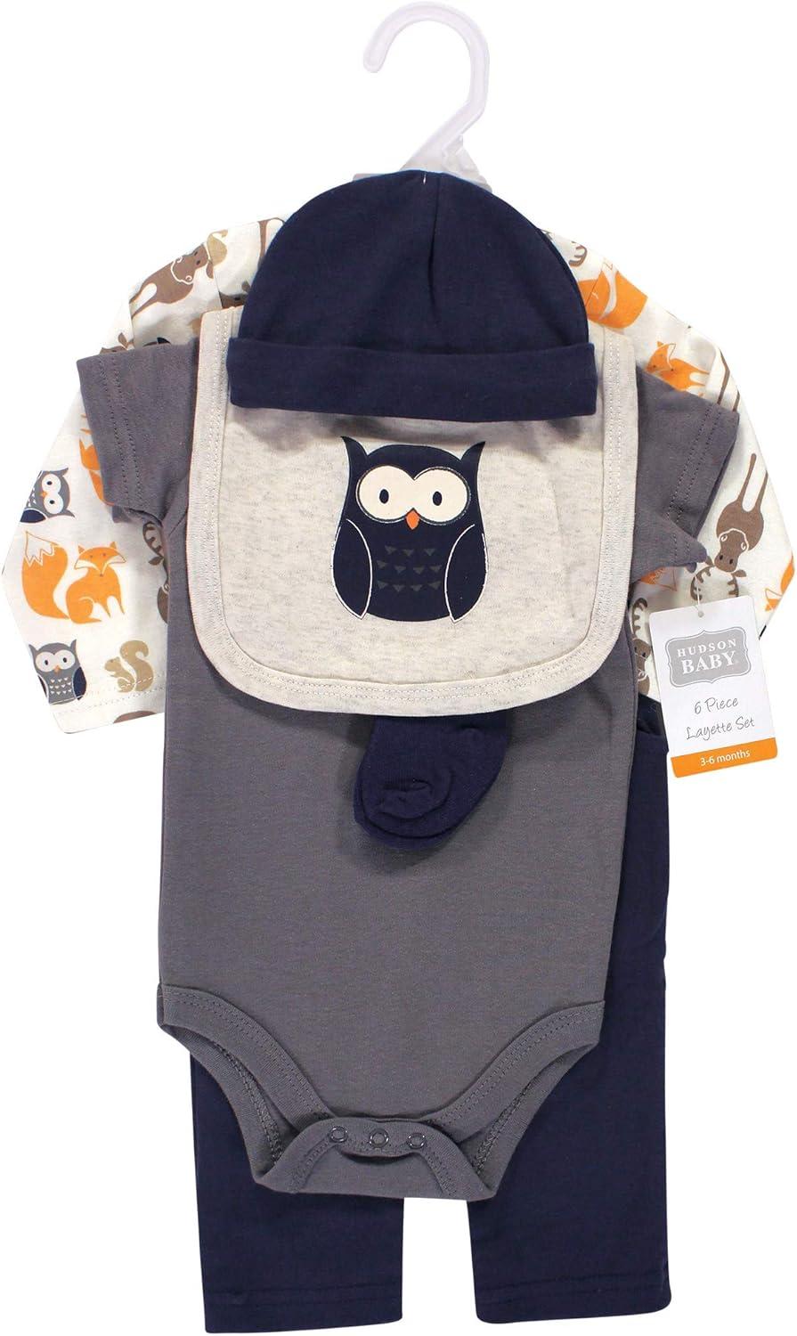 Hudson Baby baby boy's and baby girl's 6 piece layette set includes 2 bodysuits, 1 pair of pants, 1 bib, 1 pair of socks and 1 cotton cap. This mix and match outfit make adorable and trendy options for your little one's wardrobe. Bodysuit, pants and cap are made of 100% super soft cotton, while bib is made of cotton blend to help catch and absorb any drools or spills! Socks are also a cotton blend to stretch with baby's growing feet! Bodysuits have snap closures to make dressing time a breeze. These sets make the perfect baby shower gift!