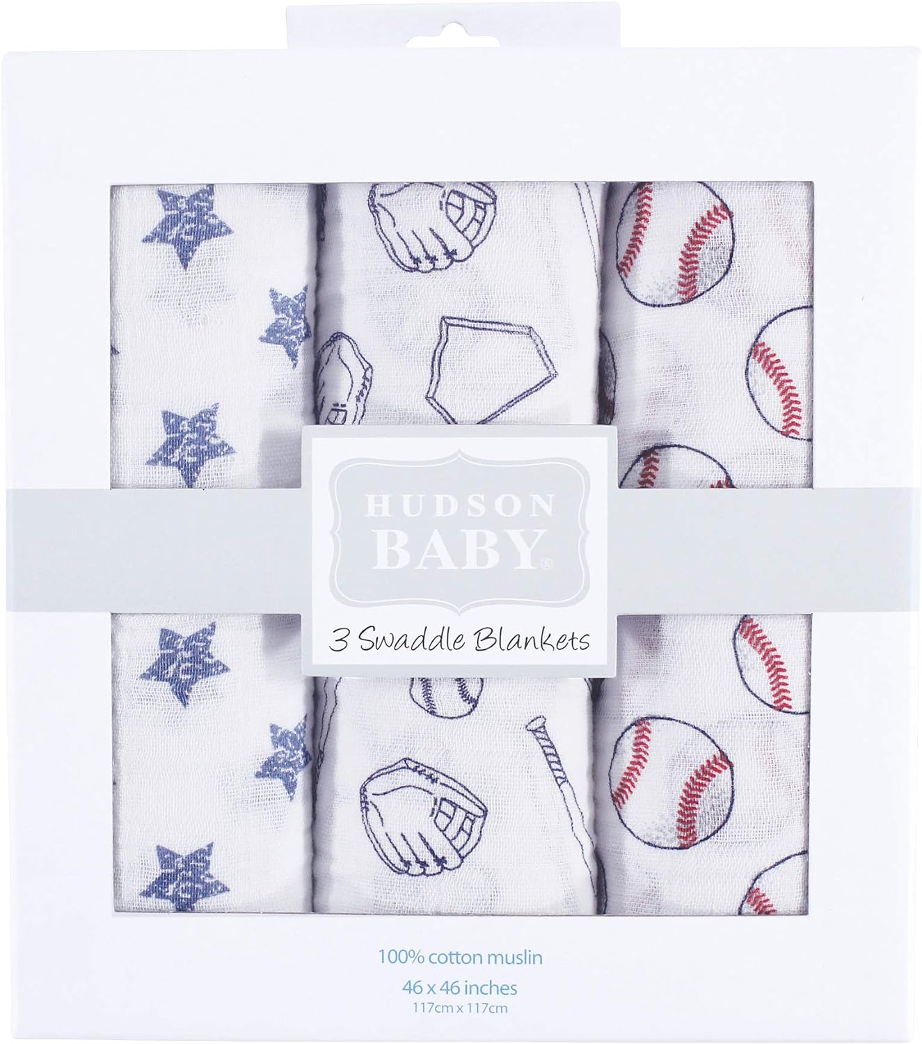 Hudson Baby Unisex Baby Cotton Muslin Swaddle Blankets, Woodland 3-Pack, 3-Pack(Baseball)